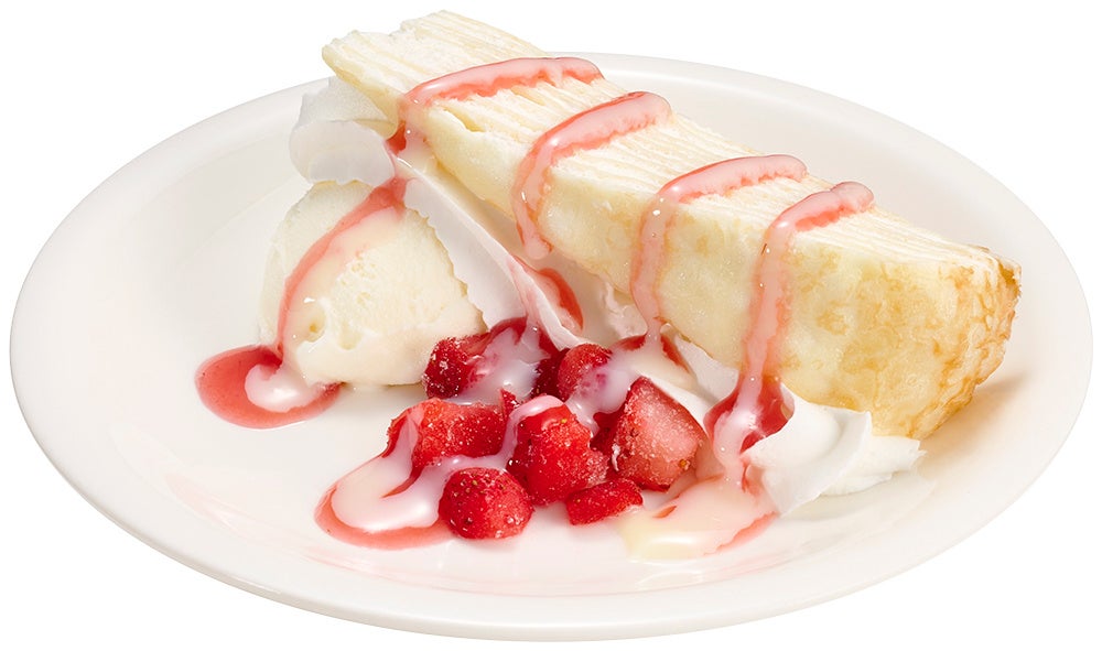 今回のフェアに合わせて定番スイーツも様変わりします!「白いミルクレープ」は、北海道の雪をイメージして生地もクリームも真っ白に仕上げた逸品です。北海道産小麦を使用したしっとり柔らかい真っ白な生地は、北海道産練乳を使用したコク深い白いクリームと相性抜群です。「白いミルクレープのメルバ」は、素材にこだわり、ミルクレープ、マスカルポーネミルクアイスには北海道産の素材も使用しています。真っ白なミルクレープとアイスに、イチゴソースとイチゴダイスの赤が映え、ミルキーな味わいも見た目も大満足な一皿になっています。
