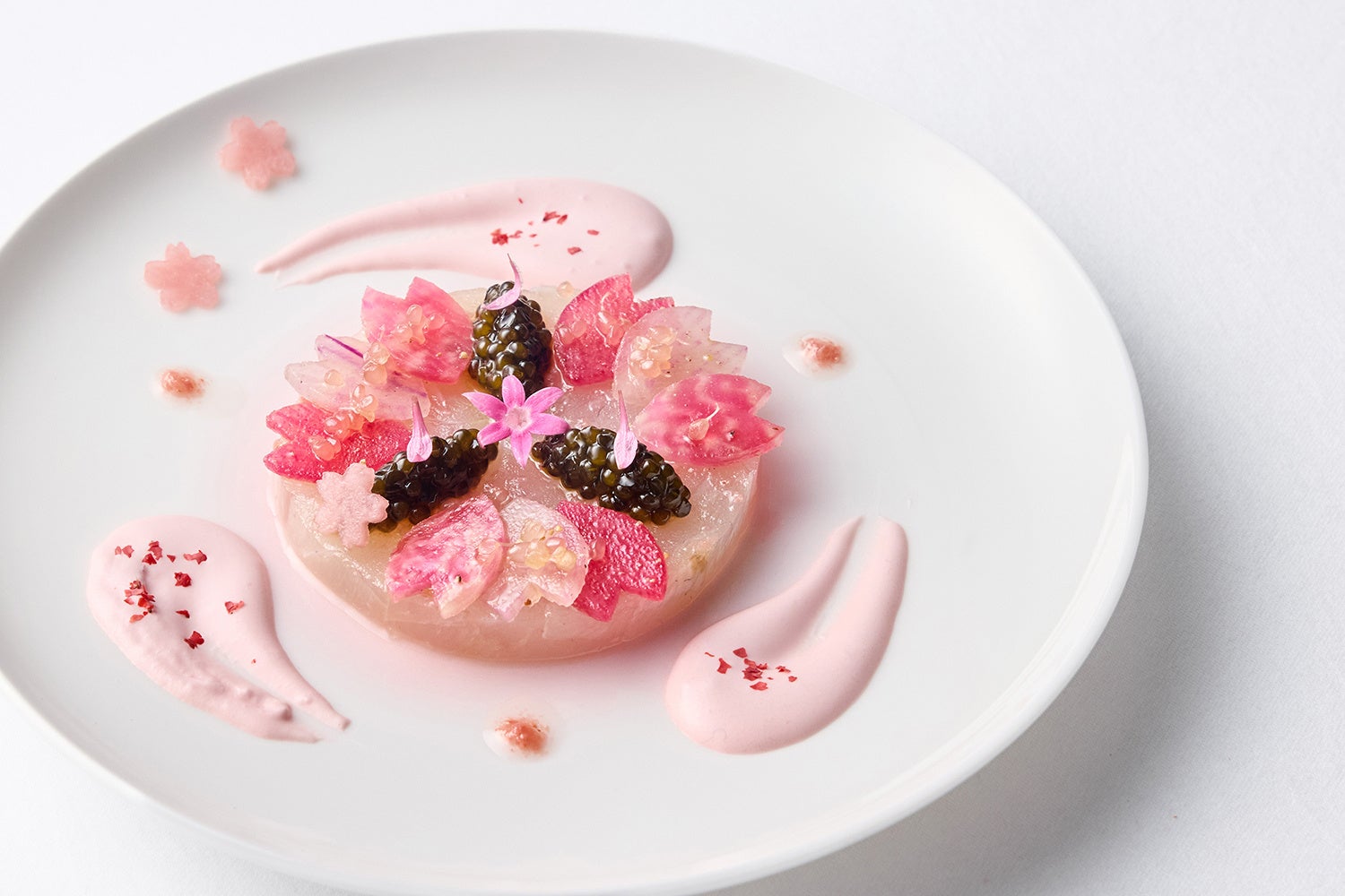 『桜鯛のカルパッチョとキャビア 花弁に見立てたコポー 柚子香るサワークリーム』