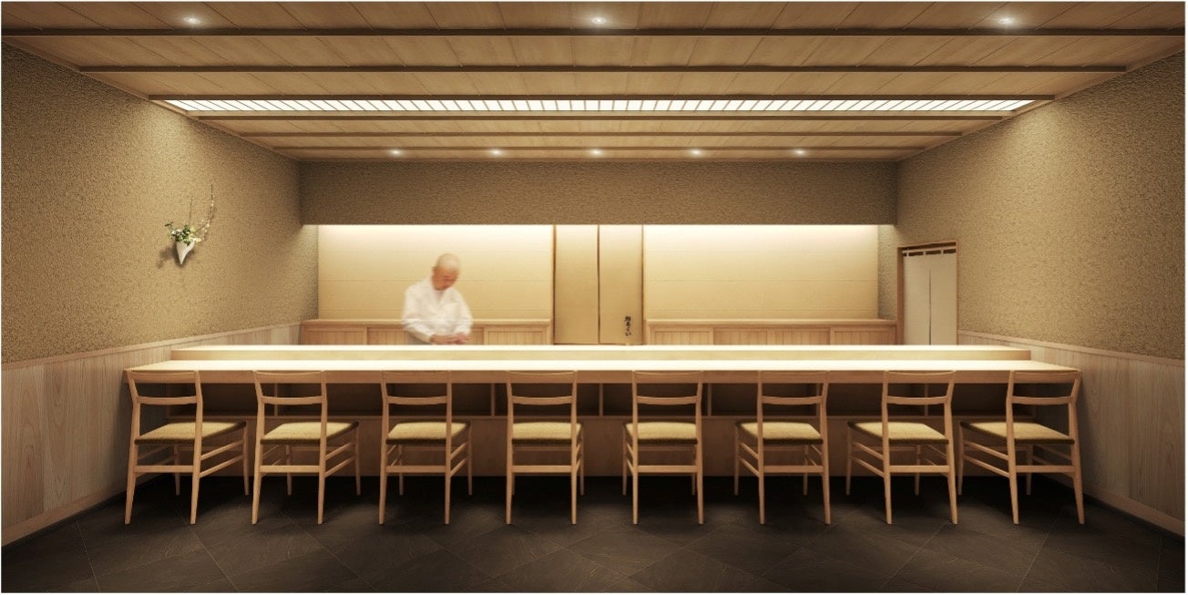店舗の設計はオヤマツデザインスタジオが行い、内装に使用する材料の調達や施工時の技術指導を板井工務店が担当、施工を船場が担当しました。店内は8席の鮨カウンターと1つの個室を備え、ミニマルな和のデザインを基調に、木曽檜や北山杉を使った日本の職人技が随所に生かされています。