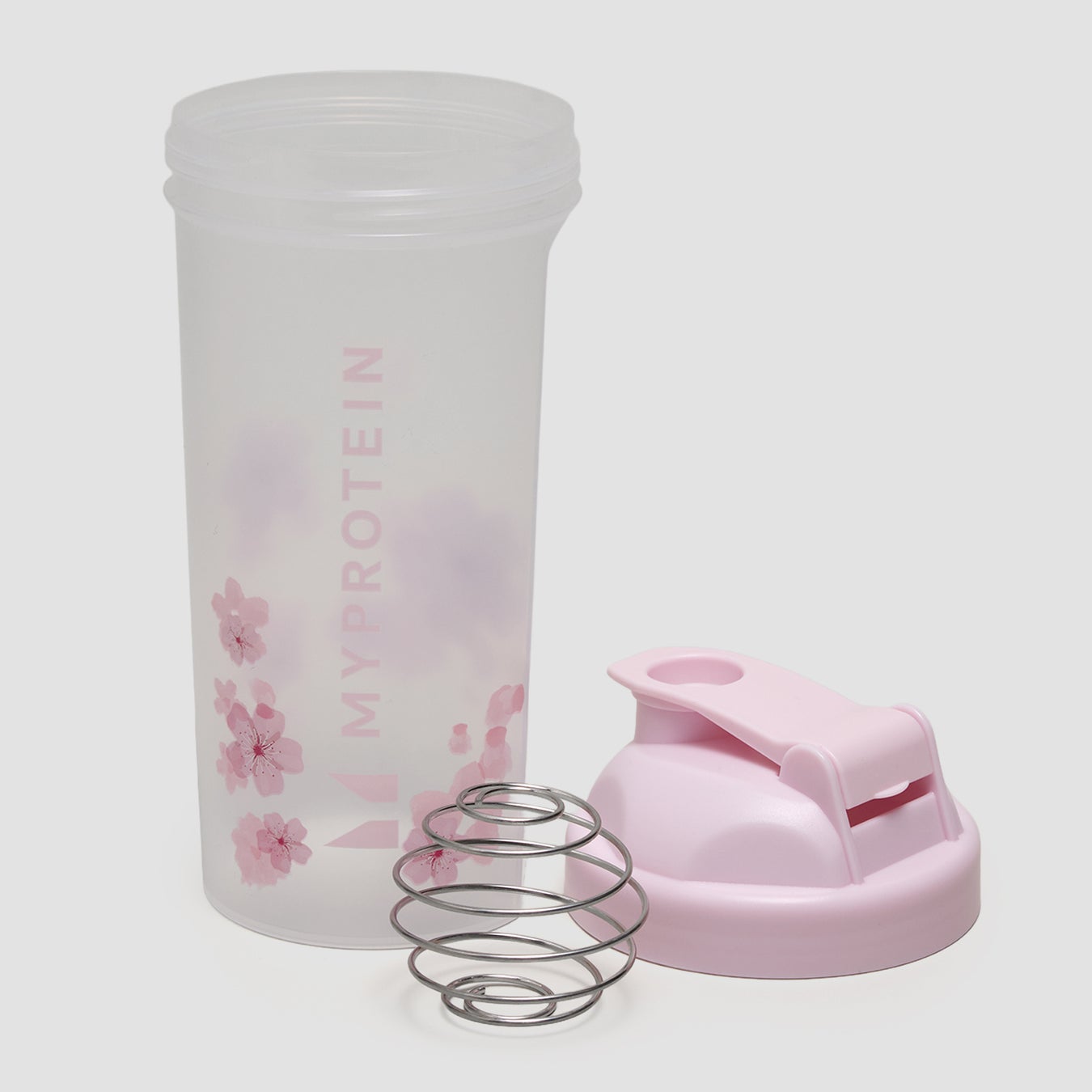 春らしい桜デザインをあしらった、600ml容量のプラスティック製プロテインシェイカー。