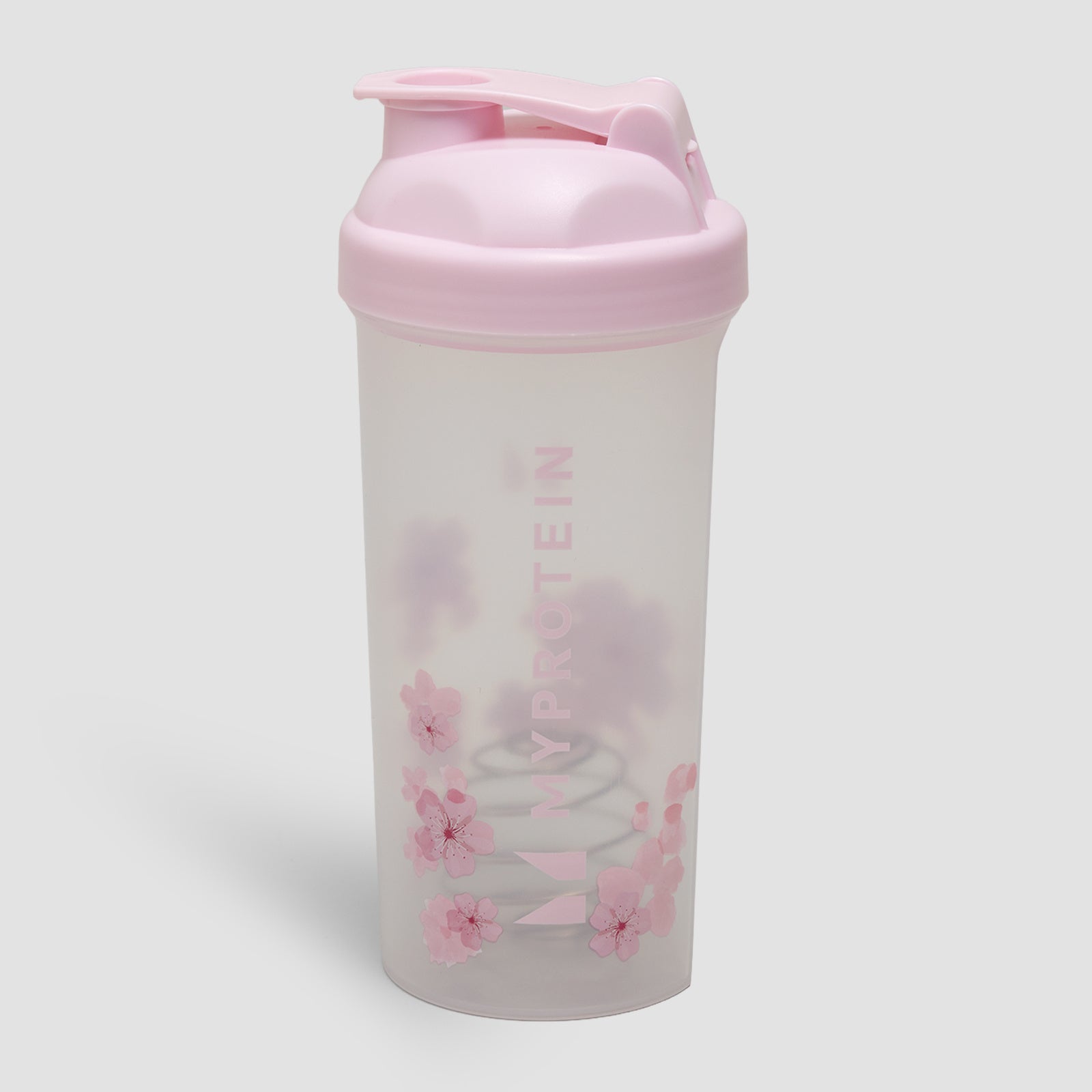 春らしい桜デザインをあしらった、600ml容量のプラスティック製プロテインシェイカー。