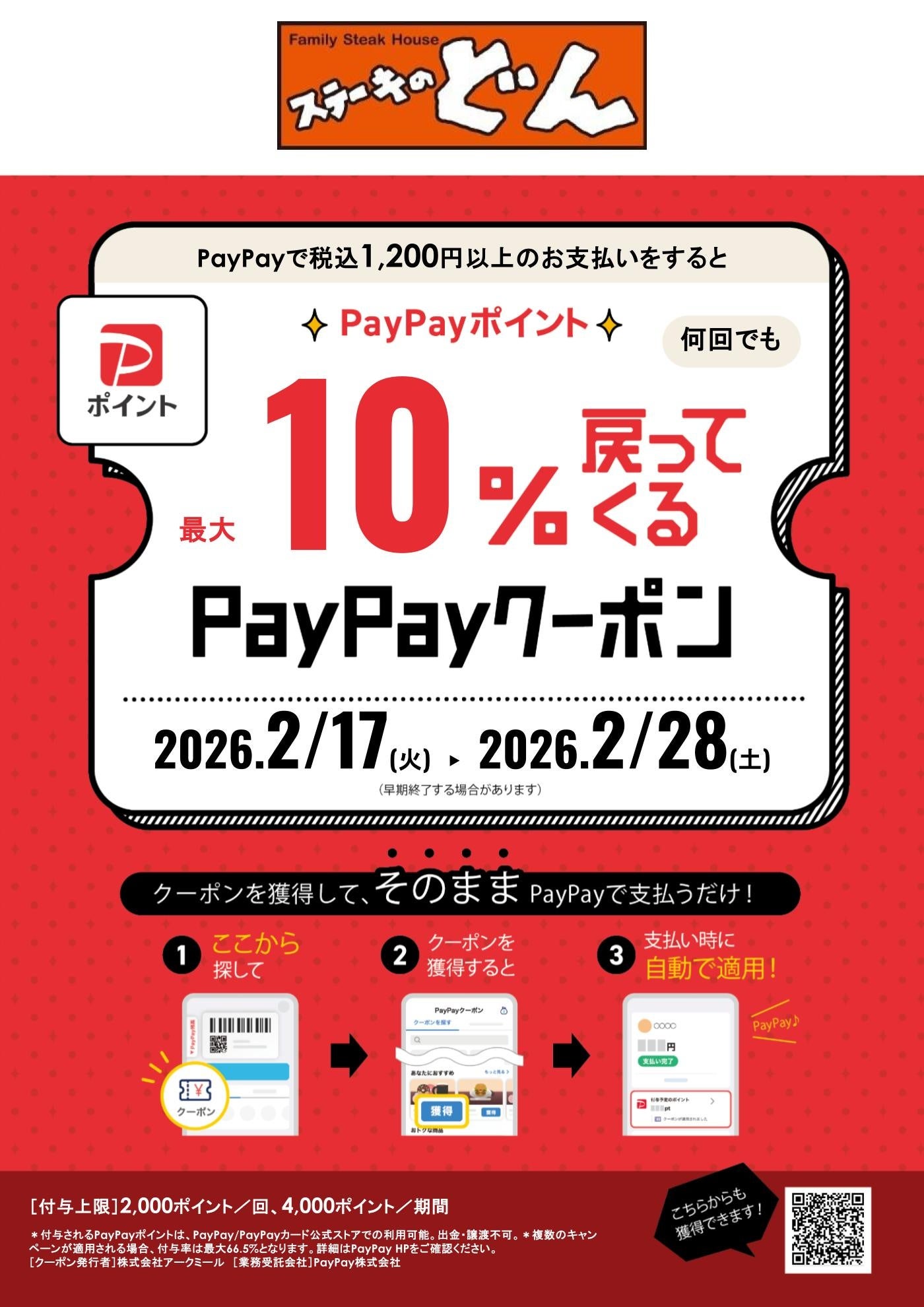 株式会社アークミール(本社:埼玉県さいたま市、代表取締役社長:柳 先)が運営する「フォルクス」・「ステーキのどん」・「しゃぶしゃぶどん亭」の3ブランドで、2026年2月17日(火)~2026年2月28日(土)の期間で最大10%戻ってくるPayPayポイントプレゼントキャンペーンを実施します。