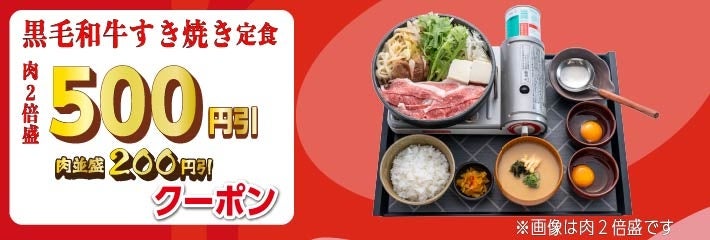本キャンペーンでは「黒毛和牛のすき焼き定食」を200円引き、「黒毛和牛のすき焼き定食 肉2倍盛り」を500円引きのクーポンを宮本むなし公式アプリで配信いたします。