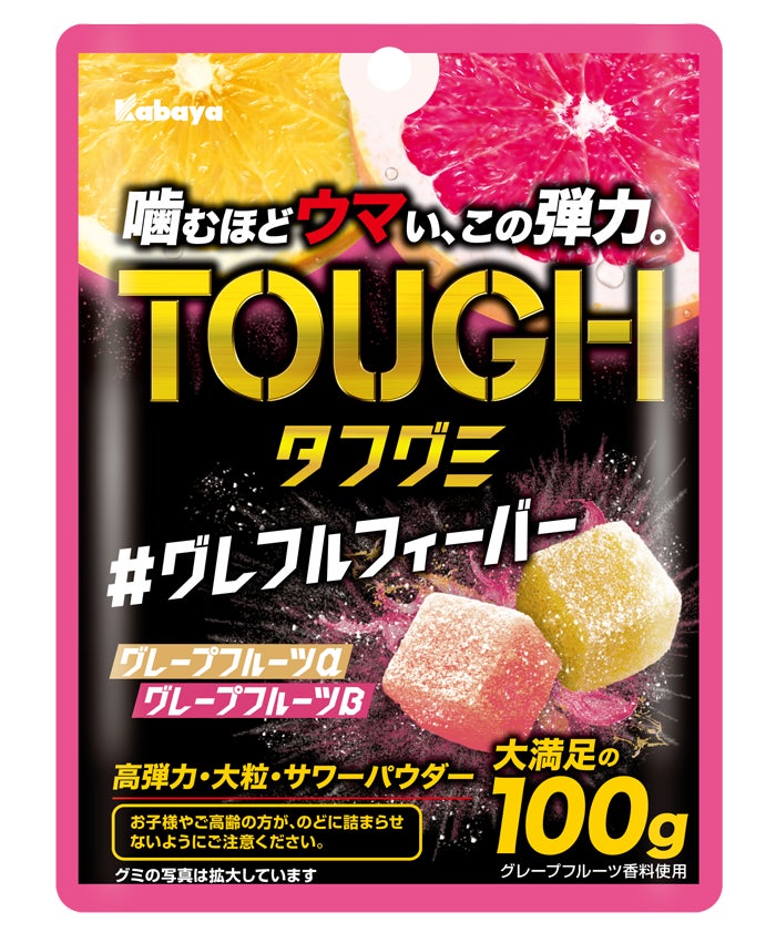 当社は、『タフグミ グレフルフィーバー』を2月17日(火)より期間限定で発売します。男性だけでなく女性からの人気も高いグレープフルーツを、『タフグミ』らしいサワーパウダーの刺激的な爽快感とあわせました。ほろ苦さと酸味が効いたホワイトグレープフルーツ風味の“グレープフルーツα”と、フルーティーな甘みが特長であるピンクグレープフルーツ風味の“グレープフルーツβ”の2種アソートで楽しめます。