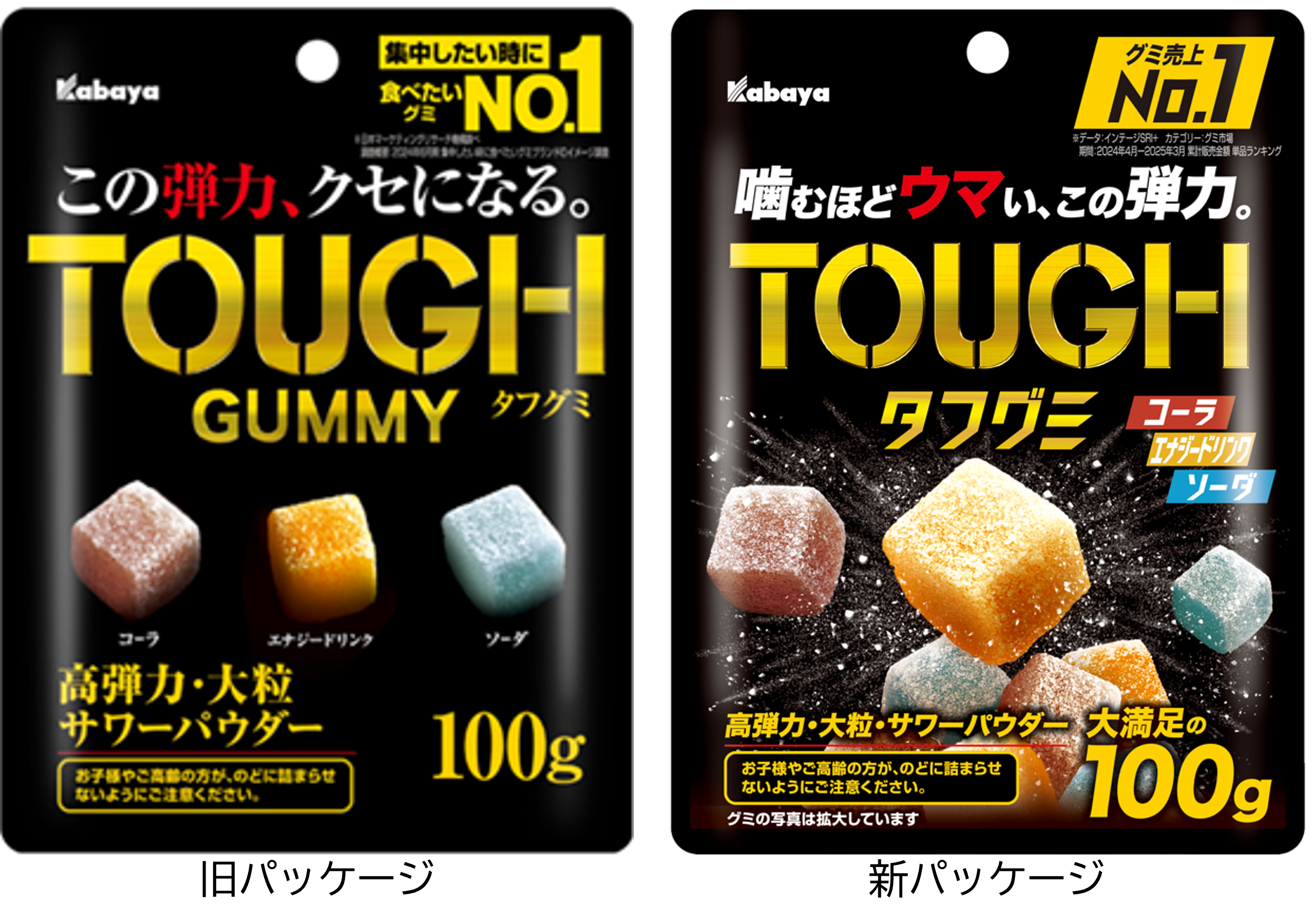 『タフグミ』ブランドらしさを象徴する黒を基調にゴールドのロゴを際立たせたデザインは踏襲しつつ、店頭での視認性と独自価値の伝わりやすさを高めるため、ロゴは見やすさ・読みやすさ・認知しやすさの向上を目的に書体変更とカタカナ表記を大きくしています。