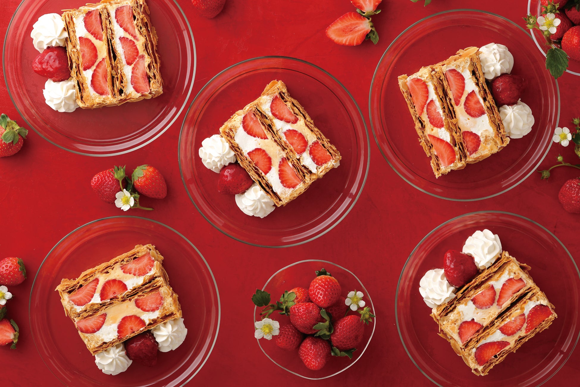 サクサクのパイ生地で、苺とクレーム・シャンティ、ディプロマットクリームを重ね合わせることで生まれる酸味と甘み、パイ生地の食感による絶妙なバランスが特徴です。