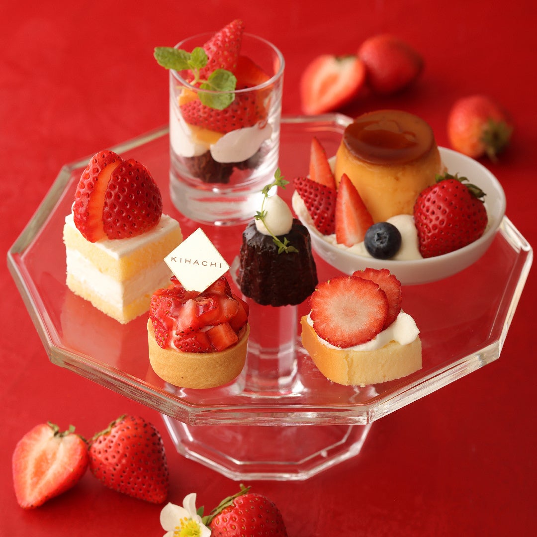 いちごシーズン第2弾のアフタヌーンティーは、甘くみずみずしい真っ赤な苺「あまおう」が主役。パフェ、タルト、ショートケーキ、こだわり卵のプリン・ア・ラ・モードなど、あまおう苺を盛り込んだキハチ自慢のスイーツが勢揃いし、セイボリー3種とともにお楽しみいただけます。