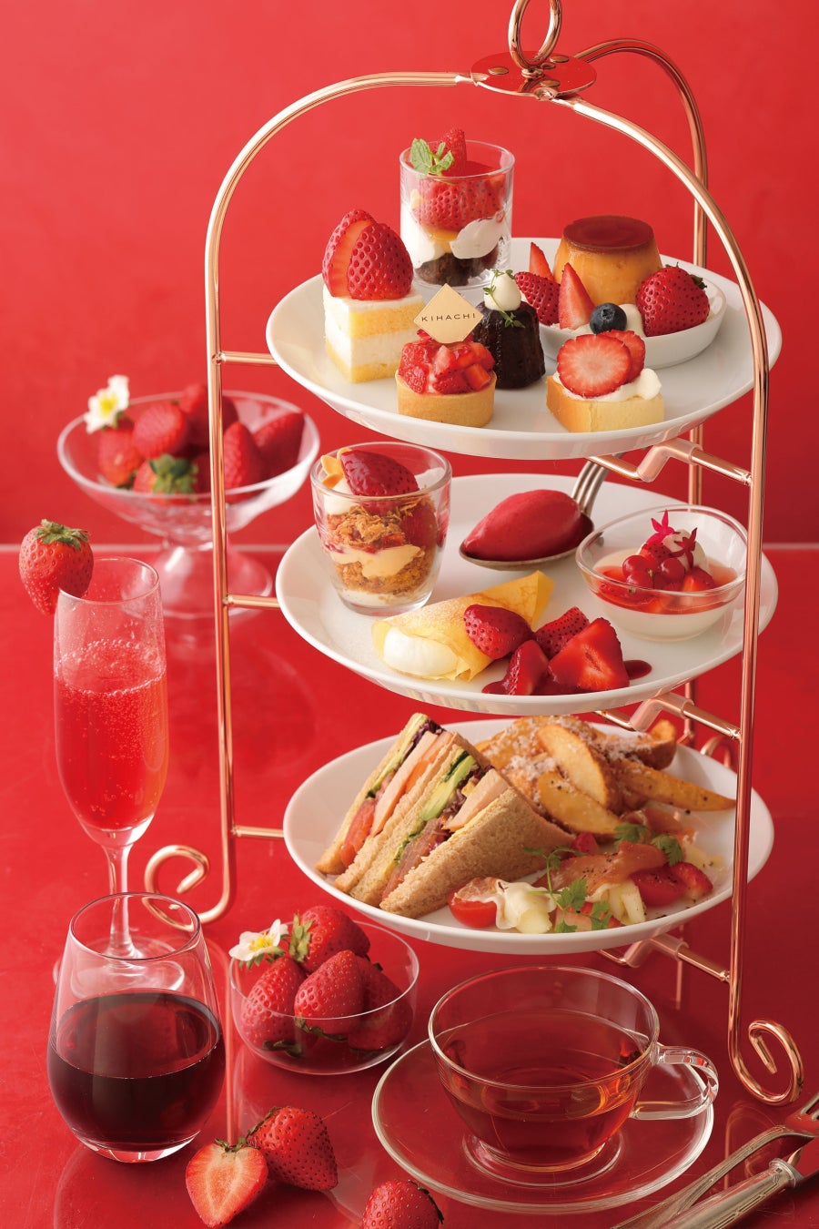 毎年、苺がいちばん美味しい季節に、苺をふんだんに使ってご提供しているキハチ 青山本店限定のアフタヌーンティー。今年も甘くみずみずしい、真っ赤な「あまおう」でご用意しました。