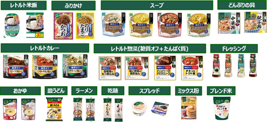 からだシフト「糖質コントロール」シリーズ(常温)は、ごはんや麺のような主食はもちろん、カレーや丼の具などのおかず、小腹を満たせるスープ類、ドレッシングなど、全32SKUをご用意しています。
