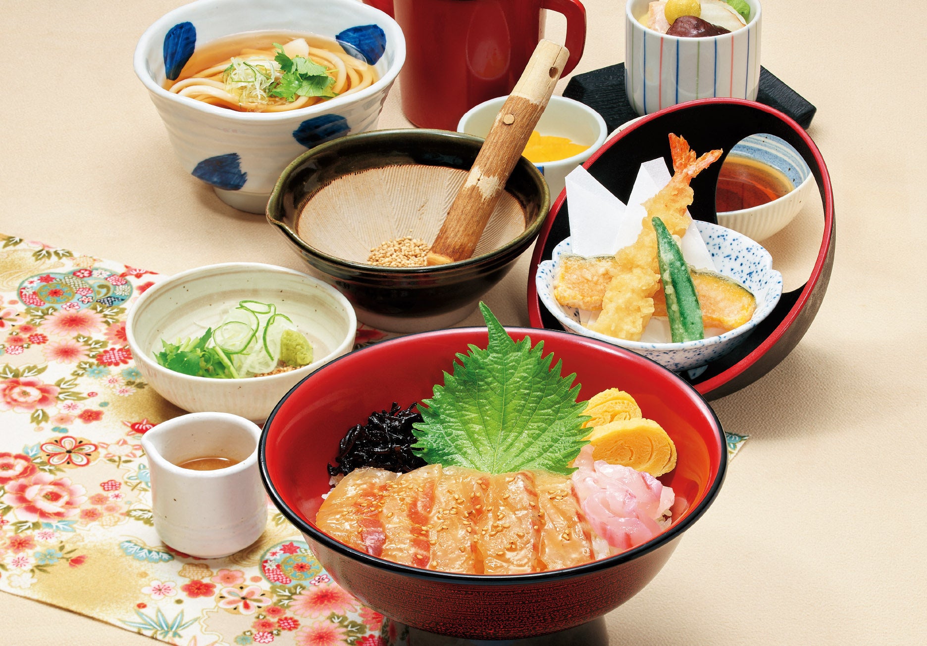 海苔と梅の特製たれ『鯛めし御膳』(うどん・天ぷら・茶わん蒸し付)