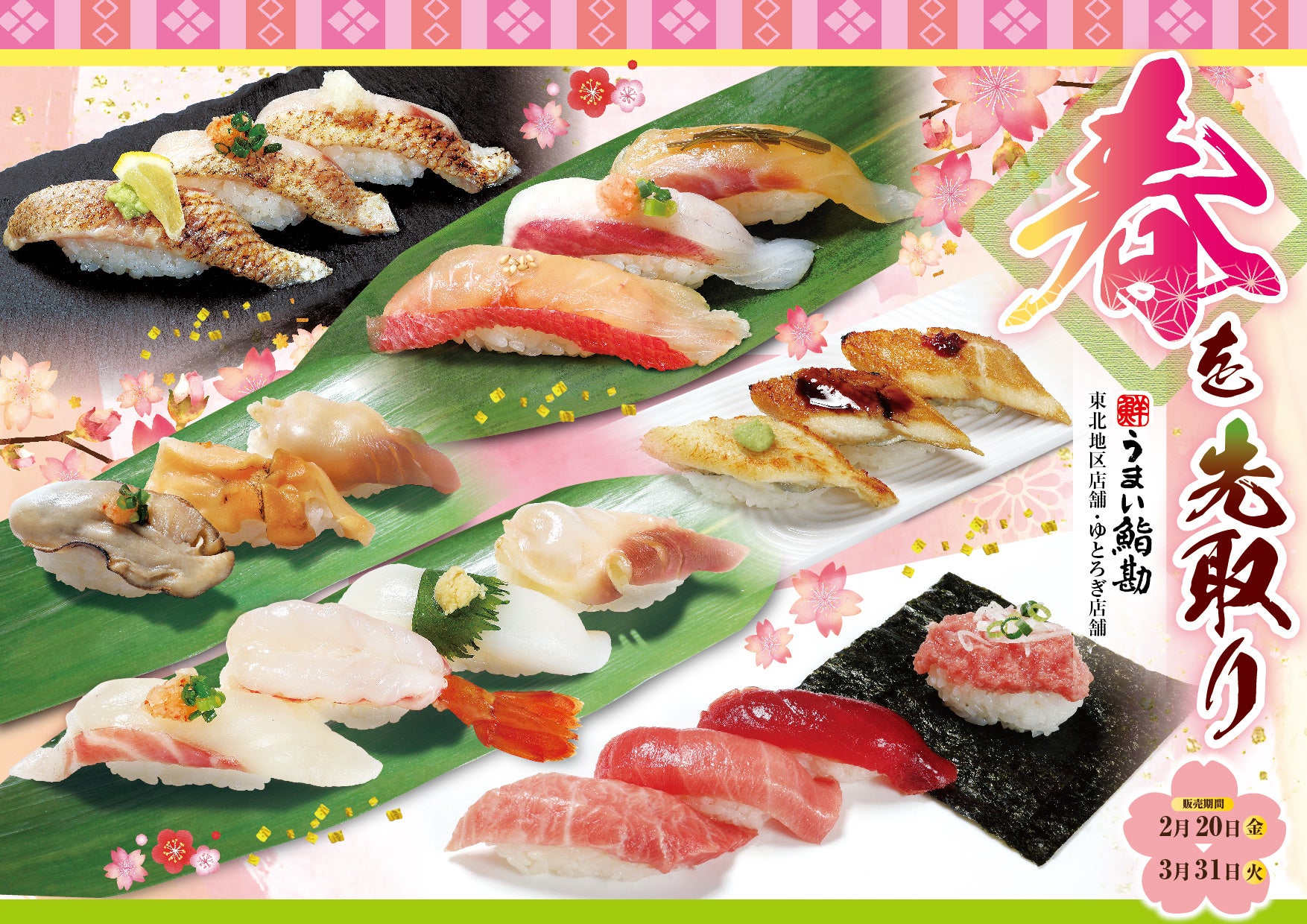 肌寒い季節は続きますが、暦の上ではもう春。入荷する鮮魚も春の顔ぶれ。待ちに待った春の味わいを、お寿司で堪能してはいかがでしょうか。うまい鮨勘では、回転寿司店舗・ゆとろぎ店舗、東北対面寿司店舗それぞれの業態で、この時期限定のネタを取り揃えたメニューを販売いたします。