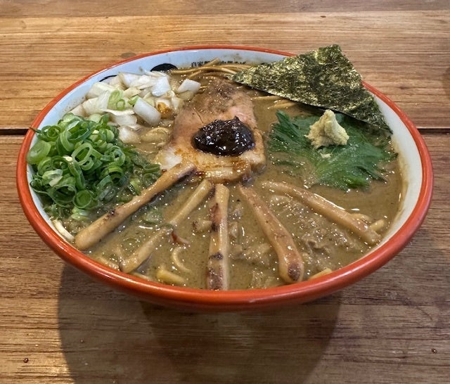本店から5年ぶりの復活。強烈な“イガ(イカ)感”のマニア向けな一杯。イカが苦手な方はご遠慮ください。スルメイカやホタルイカの煮干しや平子にぼの乾物系とイカのゴロ(肝)や身などを使用した乾物+鮮魚系ラーメン。イカ特有の濃厚なコク、ほろ苦さ、酸味が一体となった、他に類を見ないパンチのあるスープです。トッピングに、イカの燻製やゴロペースト等も入っており、「イカ尽くし」の一杯となっております。イカのリゾット風で食べる「追い飯セット」も是非。