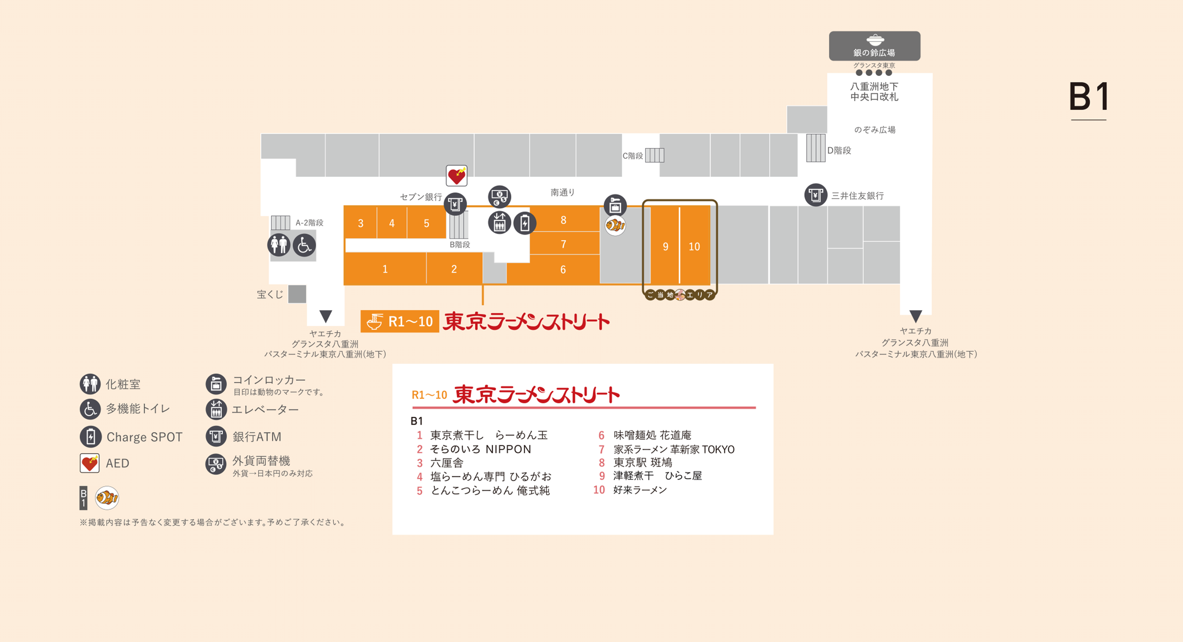 店舗:「東京煮干し らーめん玉」「そらのいろ NIPPON」「塩らーめん専門 ひるがお」「とんこつらーめん 俺式 純」「六厘舎」「東京駅 斑鳩」「味噌麺処 花道庵」「家系ラーメン 革新家TOKYO」「津軽煮干 ひらこ屋」「好来ラーメン」