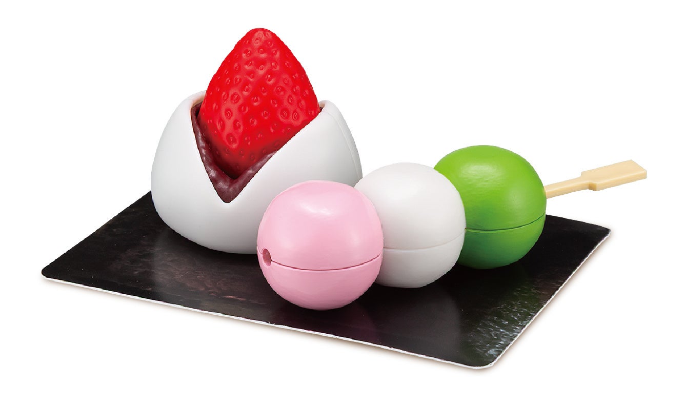 本商品はいちご大福と三色だんごをモチーフにした、和菓子を“作って楽しむ”立体パズルです。いちご大福は4個のあんこパーツから正しい組み合わせを選び、大福パーツでつつみ、最後にいちごパーツを組むと「いちご大福」が完成します。三色だんごはだんごの内側の6個のパーツから正しい組み合わせを選び、だんごの外側のパーツにぴったり入れます。最後に串パーツで差すと「三色だんご」が完成します。