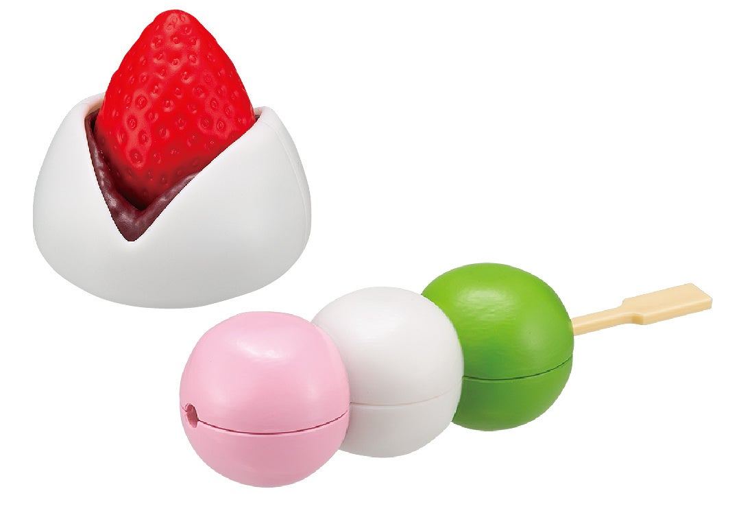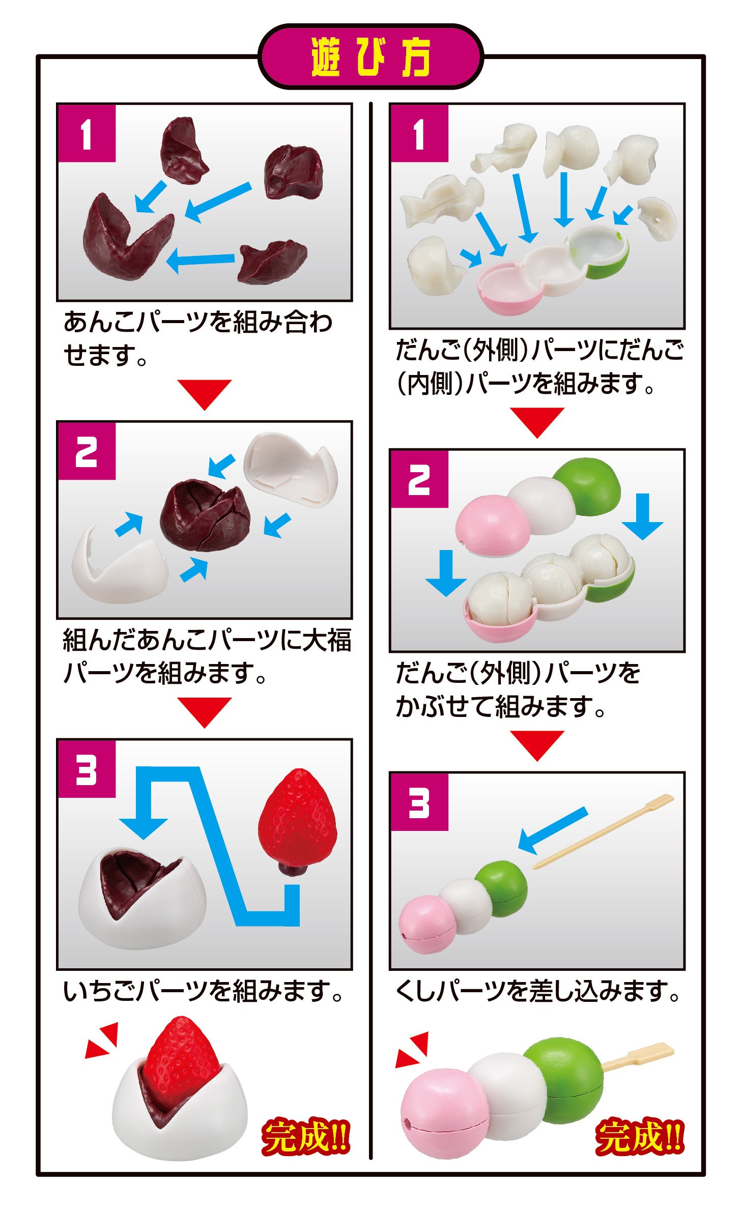 本商品はいちご大福と三色だんごをモチーフにした、和菓子を“作って楽しむ”立体パズルです。いちご大福は4個のあんこパーツから正しい組み合わせを選び、大福パーツでつつみ、最後にいちごパーツを組むと「いちご大福」が完成します。三色だんごはだんごの内側の6個のパーツから正しい組み合わせを選び、だんごの外側のパーツにぴったり入れます。最後に串パーツで差すと「三色だんご」が完成します。