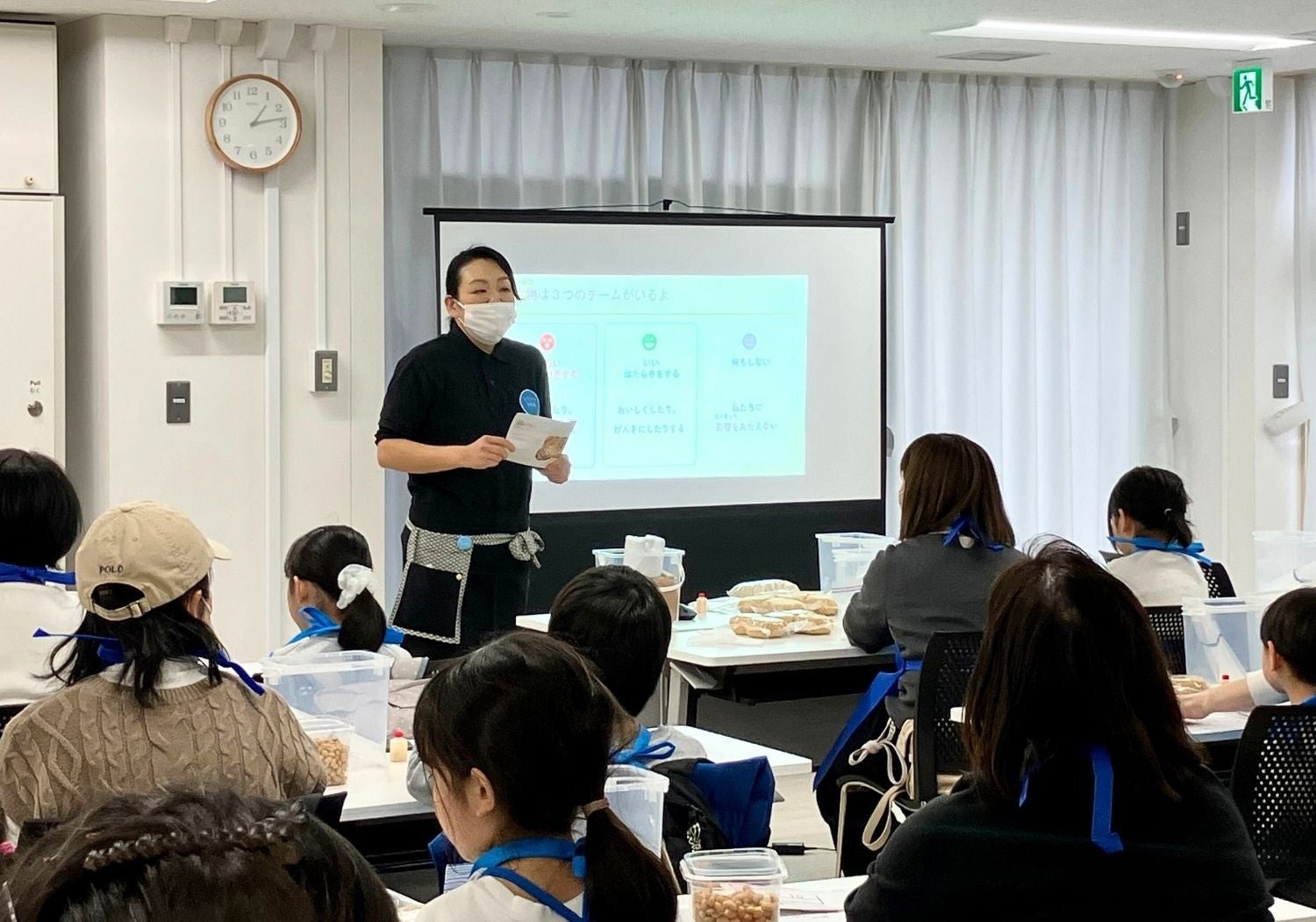 体験に先立ち、ハナマルキ「みそ作り体験館」館長が講師として登壇。「発酵と腐敗の違い」や「微生物がみそを美味しくする仕組み」について解説しました。身近な食品に隠されていた科学の不思議に、お子様だけでなく大人の方も熱心に耳を傾けていました。