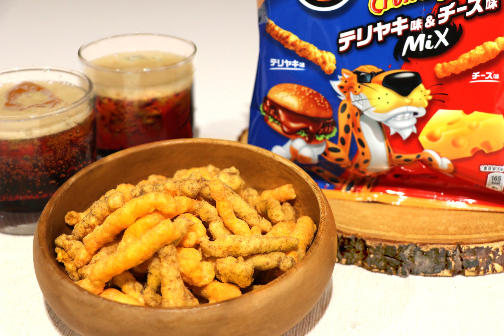 『チートス テリヤキ味&チーズ味』は、本物のチーズを使った濃厚な味わいの「チーズ味」と濃厚でやみつきな「テリヤキ味」を1袋にミックスしました。単体でも十分濃厚な味わいですが、2つの組み合わせで一段階上のやみつき感が楽しめます。さらに、2つの味を一緒に食べると「テリヤキチーズバーガー味」に味わいが変化し、「チートス」の遊び心が感じられます。ザクザクッッ!!とした食べ応えのある食感と一段階上のやみつきになる味わいは、おやつとしてはもちろんのこと、ストレス発散したい人や気分転換をしたい人にもオススメの商品です。