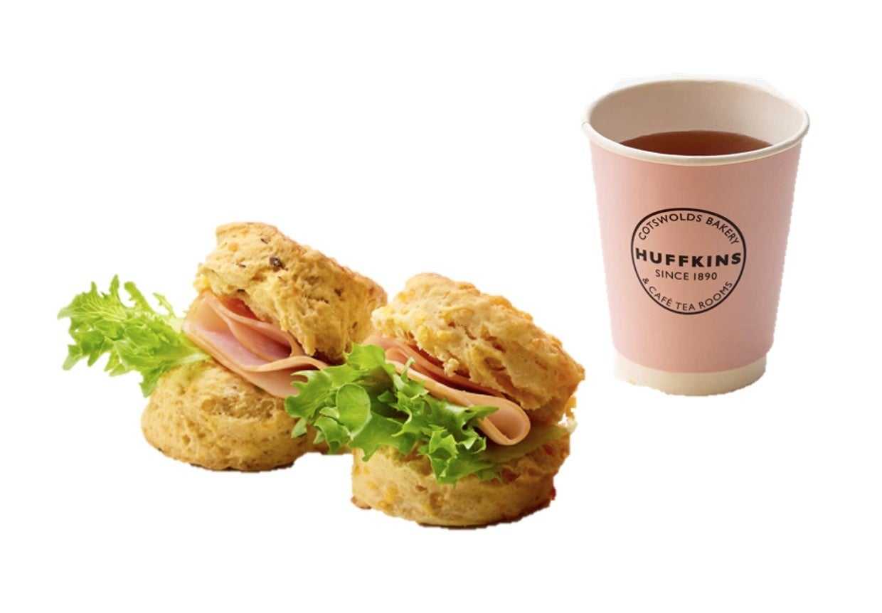 ハムとレタスを挟んだ日替わりの食事系スコーンに淹れたての紅茶をあわせたセット。