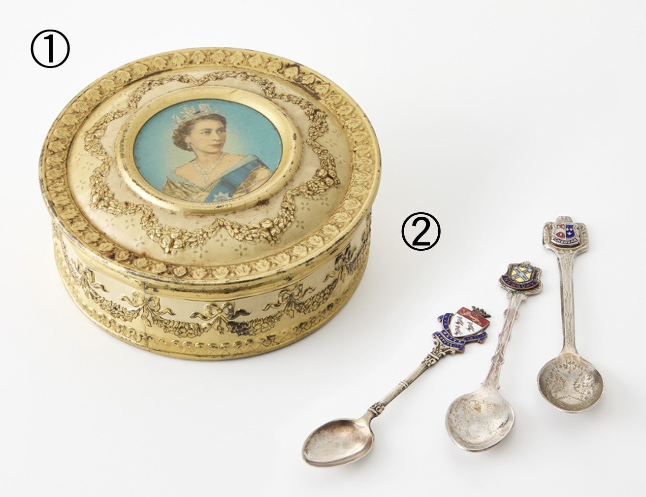 女王戴冠式記念で作られたお菓子缶&英国各地の紋章入りスプーン
