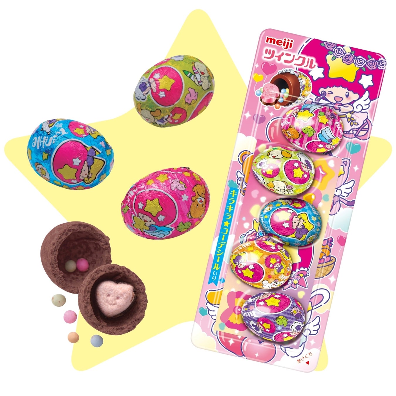 今年発売45周年を迎える、世代を問わず多くの人に愛されている明治の「ツインクル」。5色の銀紙に包まれた、かわいいたまご型のミルクチョコレートには、5種類のお菓子とカラフルなミンツが♪