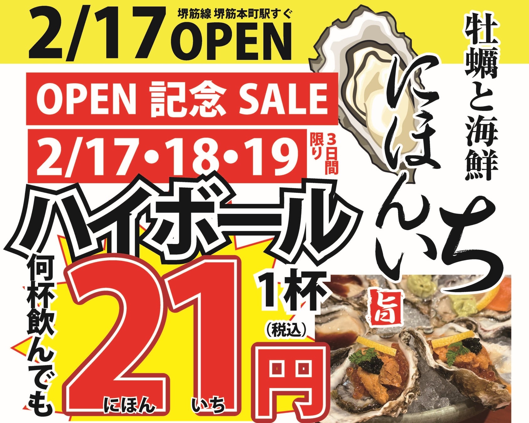 株式会社N・I(本社:大阪府大阪市)の運営する「牡蠣と海鮮 にほんいち 堺筋本町店」は、2026年2月17日(火)にグランドオープンいたします 。オープンを記念し、2月17日〜19日の3日間限定で、ハイボールを1杯21円(税込)で提供するキャンペーンを実施します。
