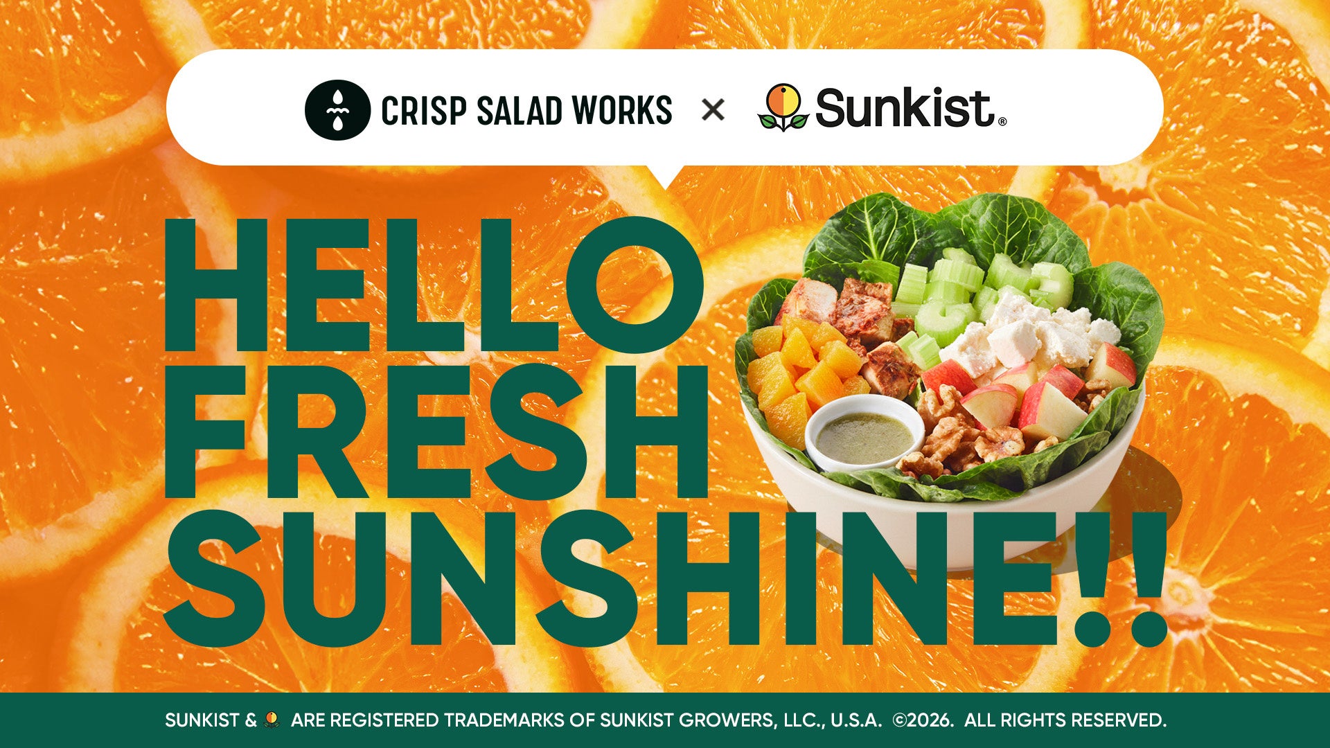 株式会社CRISP(本社:東京都港区、代表取締役:宮野 浩史)が運営する「クリスプサラダワークス」は、世界最大級の柑橘ブランド「サンキスト」を手がけるサンキスト・グロワーズ(本社:アメリカ カリフォルニア州)とコラボレーションし、サンキスト オレンジを使用した期間限定サラダを販売します。