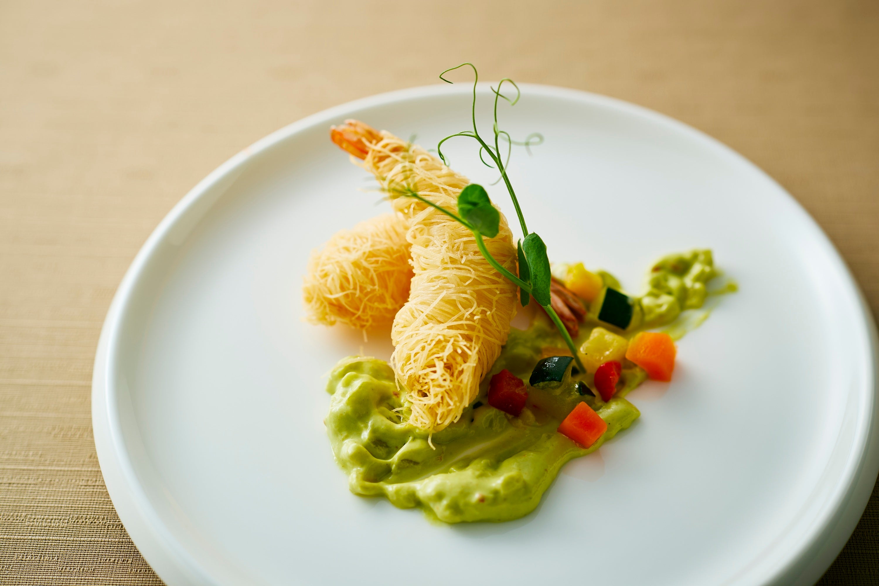 ランチ:【3月】海老カダイフ巻フライ ワカモレソース、【4月】鯛のポワレ アサリのクリームソース、【5月】鰹のレアステーキ