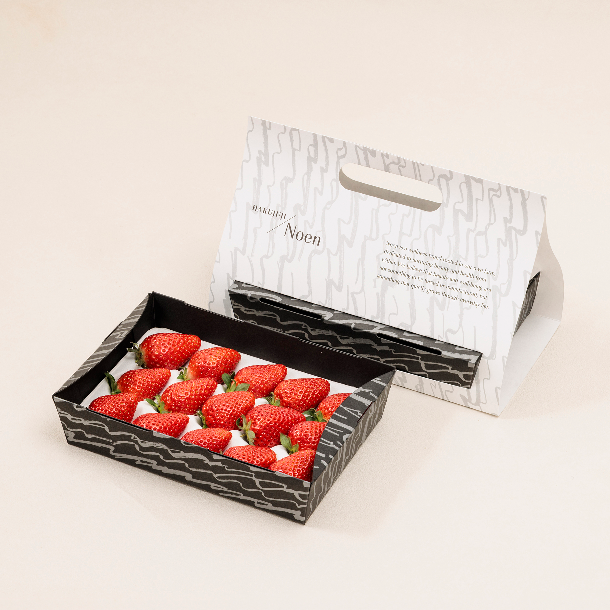 また、岡山市藤田にある自社農園で大切に栽培した3Lサイズの苺を、こだわりのオリジナルパッケージで販売いたします。完熟するまでじっくりと育てた苺は、甘さと香りがぎゅっと詰まり、口に入れた瞬間に濃厚な味わいが広がります。摘みたての美味しさと特別感を、ぜひそのまま味わってください。