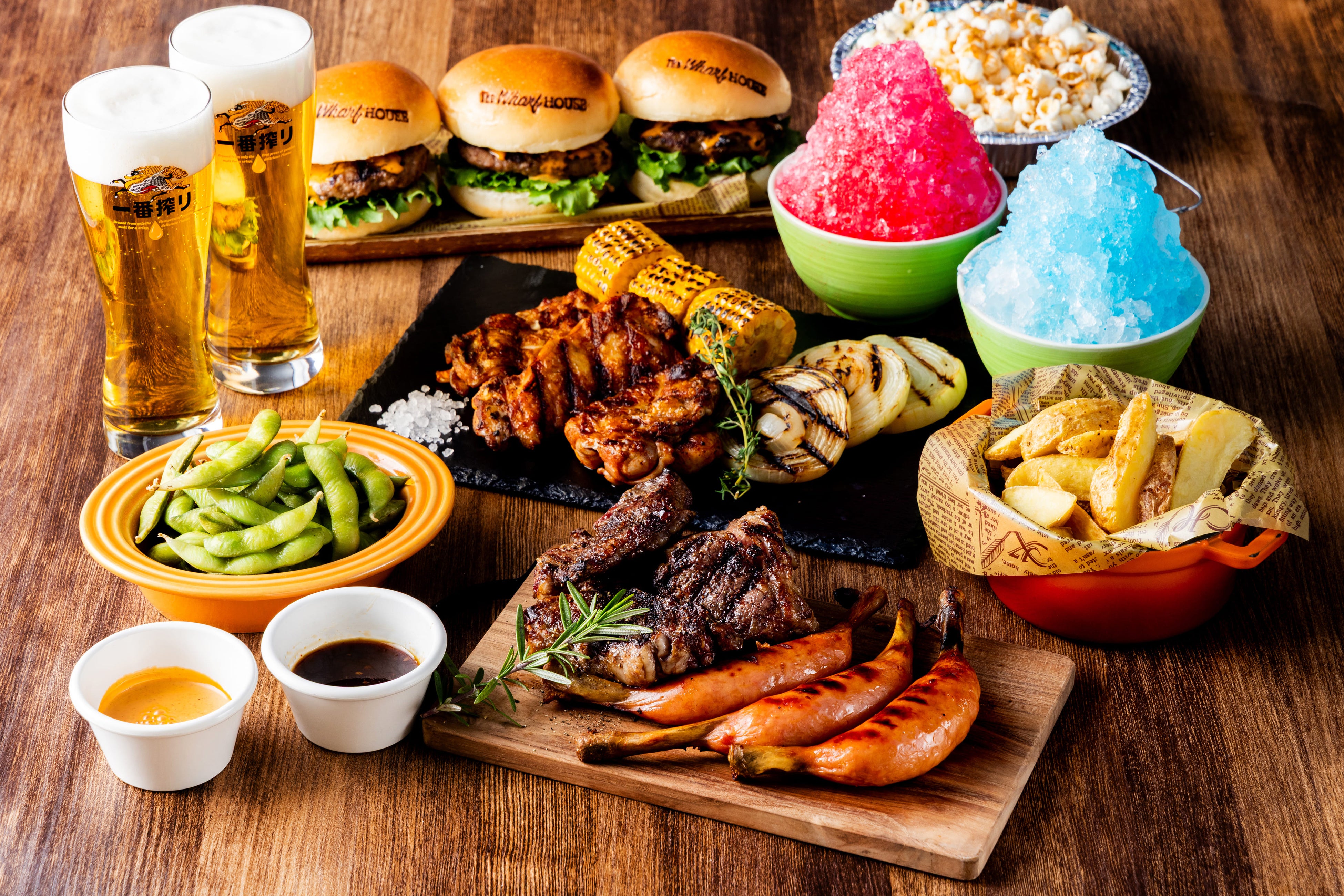 <内容>手作りハンバーガーセット/ビーフペッパーリブフィンガー/ジャークチキン/骨付きソーセージ/ホタテ/マグロホホ肉/ケイジャンシュリンプ/焼き野菜/ポップコーン/フライドポテト/えだまめ/かき氷