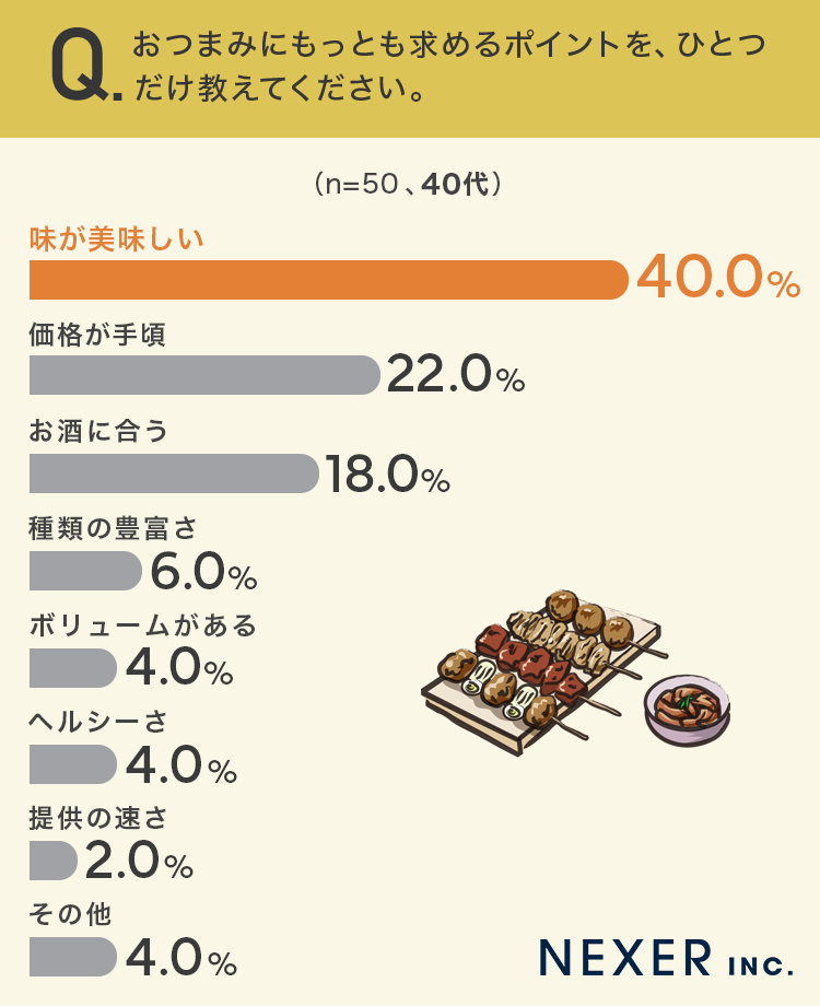 40代では「味が美味しい」が40.0%と高く、次に「価格が手頃」が22.0%と目立ちます。「お酒に合う」は18.0%で、「種類の豊富さ」は6.0%にとどまりました。40代は「美味しいものをなるべく手頃な価格で」という実用的な視点が強いようです。
