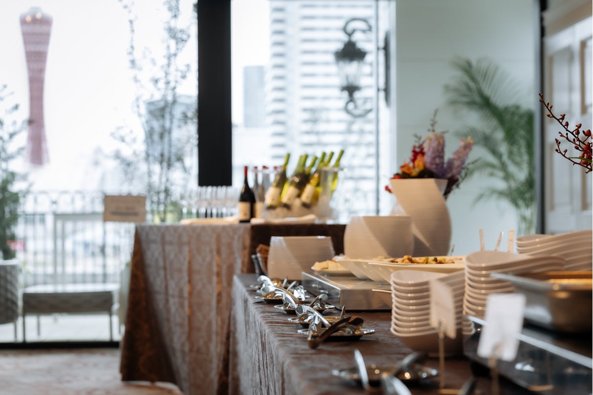 祝宴の会場となるのは、ラスイートルパンビルの3階にある「ラ・テラスホール神戸」。ラ・スイートの真髄を受け継ぐバンケットホールが特別なひとときを演出いたします。