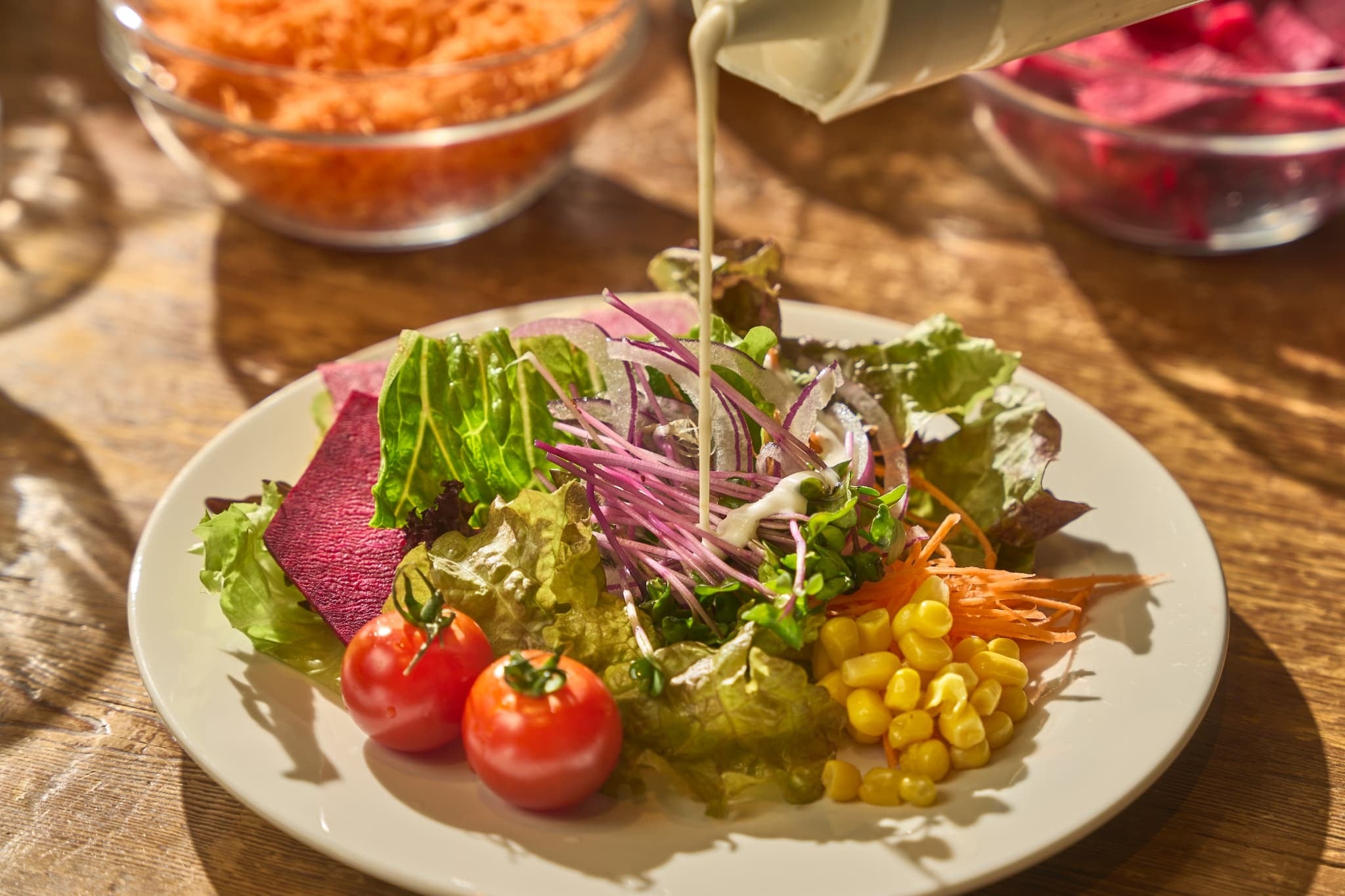 本サラダビュッフェおよびスープビュッフェは、追加料金なしで、すべてのランチメニューに含まれております。お好きなメイン料理をご注文いただくだけで、自由にビュッフェをお楽しみいただけます。軽めにヘルシーランチを楽しみたい方にも、しっかり食べたい方にもご満足いただける、バランスの取れたランチスタイルをご提案します。