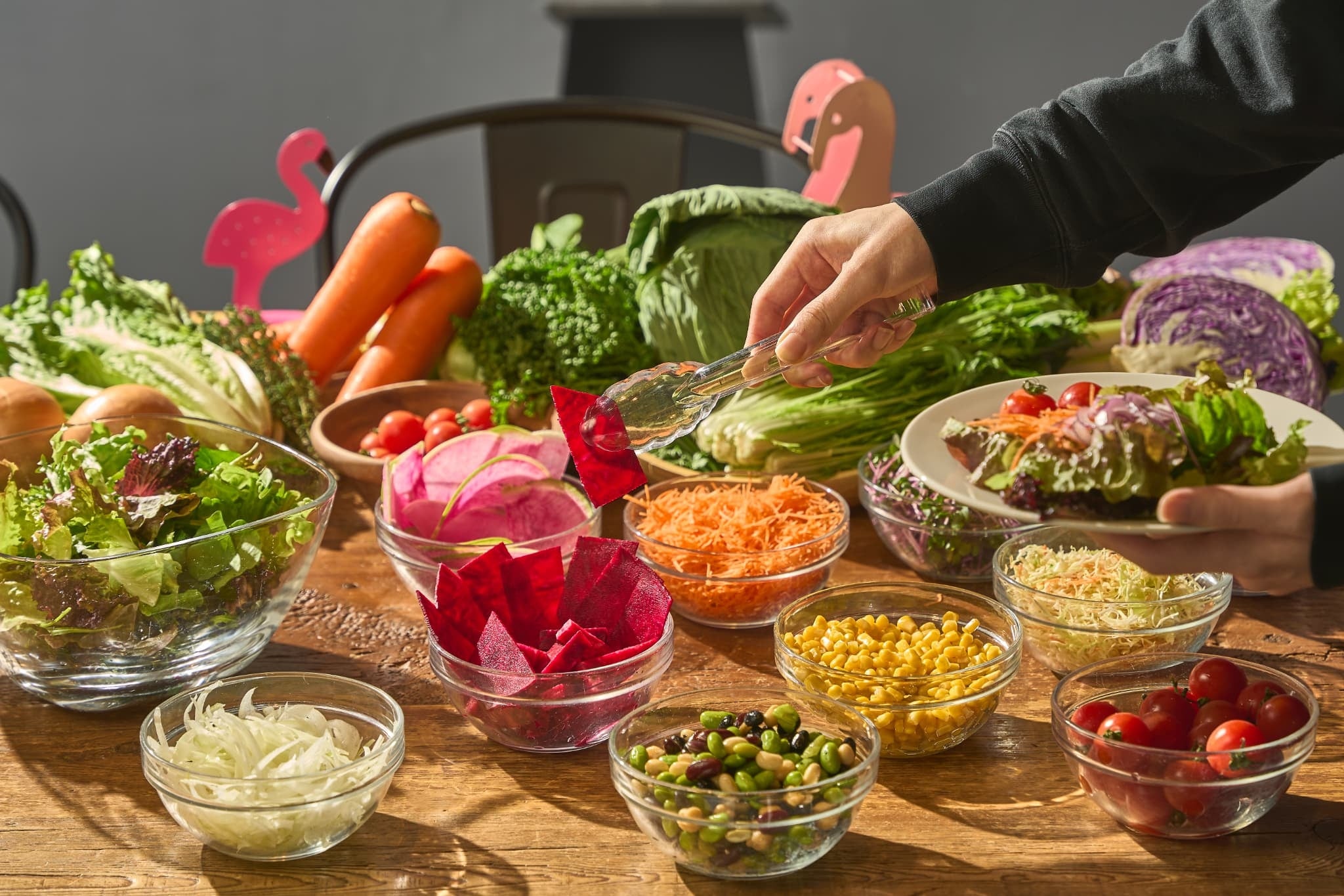 自由でカジュアルなスタイルを提案するモクシーホテルらしく、定番のグリーンサラダはもちろん、ナムルや玉子サラダ、フルーツなどバラエティ豊かなデリなどもラインナップ。彩り豊かな野菜とともに、その日の気分で自由に組み合わせてお楽しみいただけます。