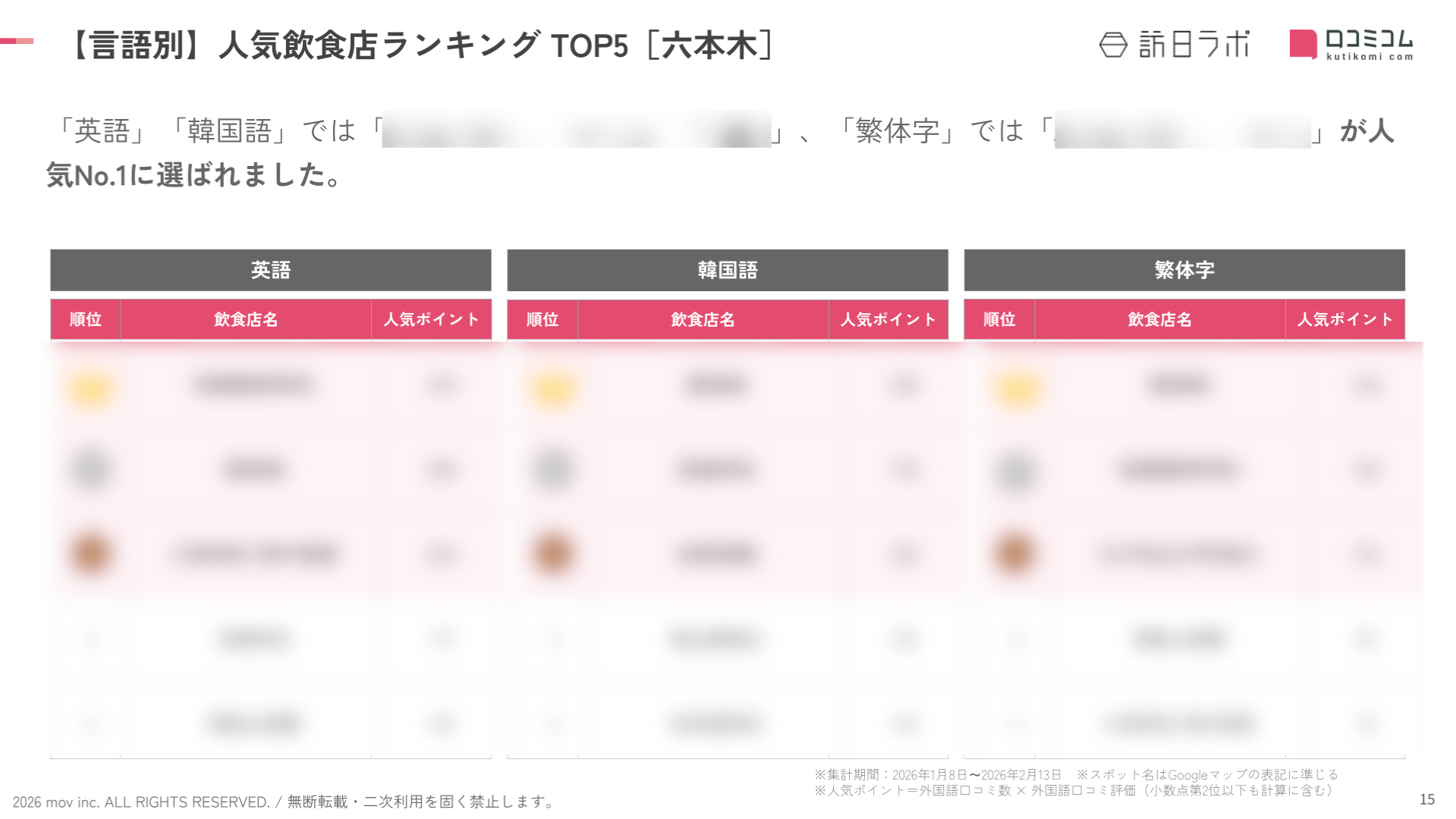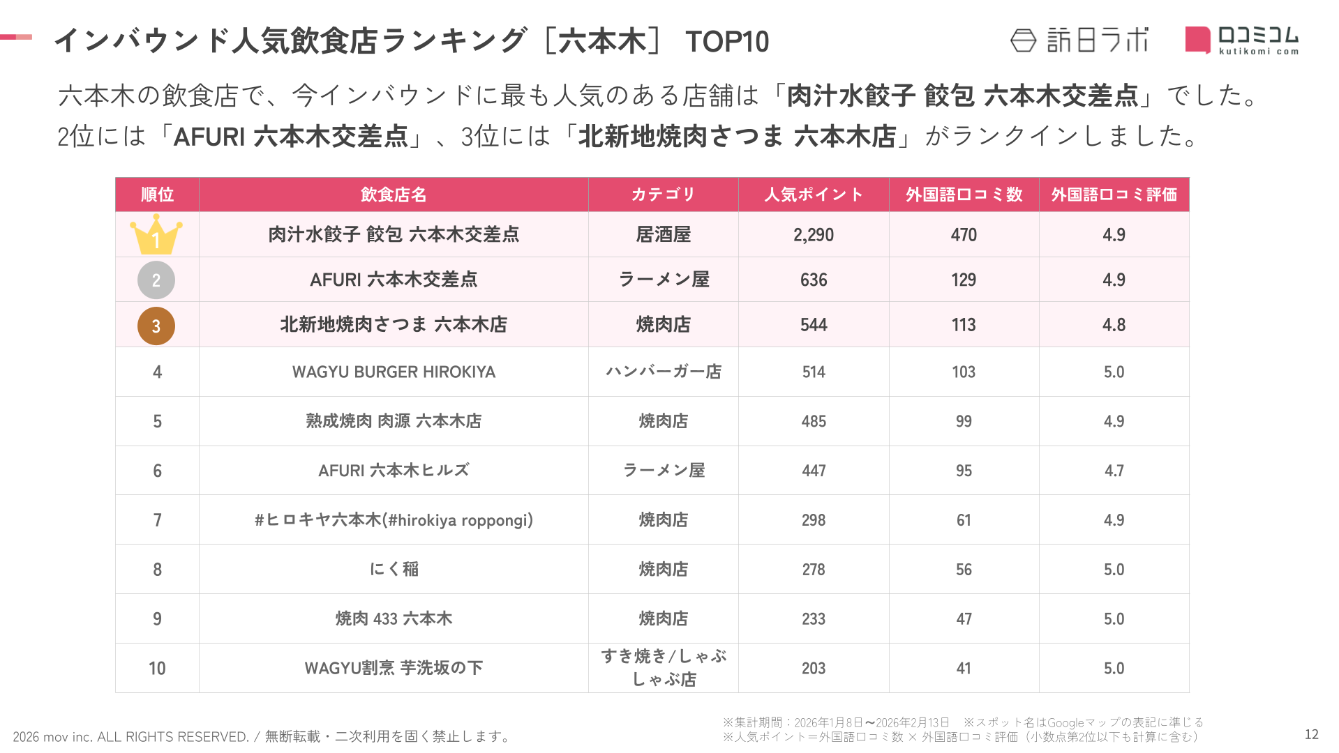 業界最大級のインバウンドビジネスメディア「訪日ラボ」及び 店舗向け集客一元化プラットフォーム「口コミコム」を運営する株式会社mov(代表取締役:渡邊 誠、本社:東京都渋谷区、以下mov)は、六本木の飲食店に寄せられた最新の口コミデータから、独自の『インバウンド人気飲食店ランキング』を発表しました。