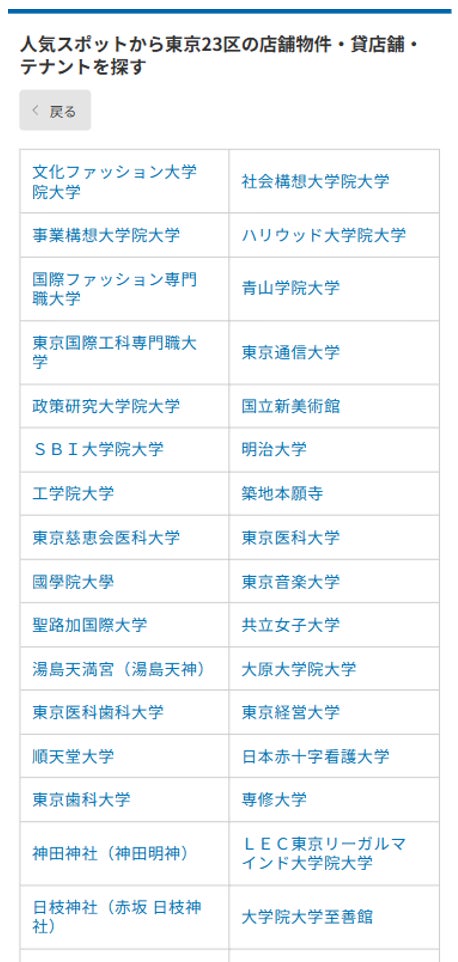 当社が選定した「集客力のあるランドマーク(大学、観光名所、大規模商業施設など)」を指定することで、周辺の店舗物件を検索することができます。