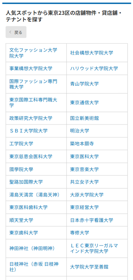 当社が選定した「集客力のあるランドマーク(大学、観光名所、大規模商業施設など)」を指定することで、周辺の店舗物件を検索することができます。