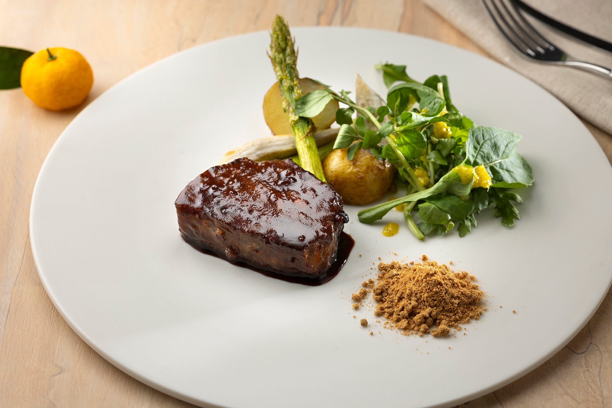 今回のコースで特におすすめしたいのは、魚料理と肉料理です。魚料理に添えた番茶の茶葉は、生産者の方から「そのまま味わってほしい」と言われたことを受け、料理に添えました。少し砕いて料理に合わせると、番茶の香ばしさがより引き立ちます。肉料理のなにわ黒牛はブレゼしており、そのままでも味わえますが、添えたきなことともに食べると印象が変わります。大和大鉄砲は大豆そのものの甘みが強く、そのきなこを合わせることでソースに自然な甘さが重なり、独特の風味が生まれます。素材の個性をいかした料理の数々を楽しんでいただければと思います。