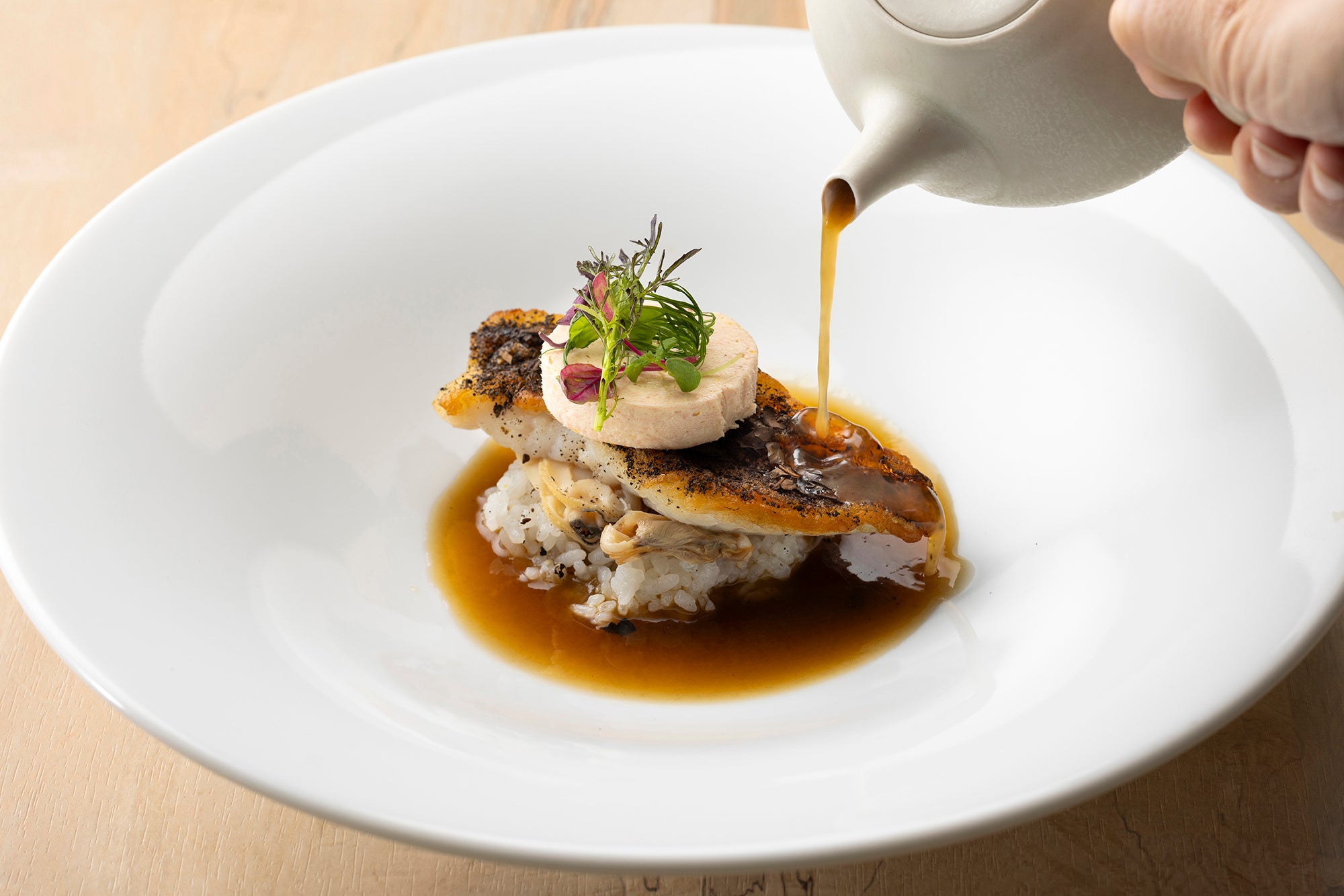 前菜では、炙り鰆のマリネを、柿の葉茶と吉野本葛で作るガレットで包み、柿の葉寿司を連想させる仕立てに。魚料理は、茶粥のイメージを重ね、メバルのポワレを茶飯や蒸した貝とともに盛り、仕上げに番茶を注いで味わうスタイルです。添えた番茶の茶葉は、そのまま味わったり、料理に合わせて香ばしさを加えたりと、自由に楽しめます。メインディッシュは、郷土料理の大和の雑煮の食べ方をヒントに、ワインで蒸し煮したなにわ黒牛にきなこを付けてお召し上がりいただきます。ワインの酸味ときなこの甘みが合わさり、お肉の味わいを引き立てます。