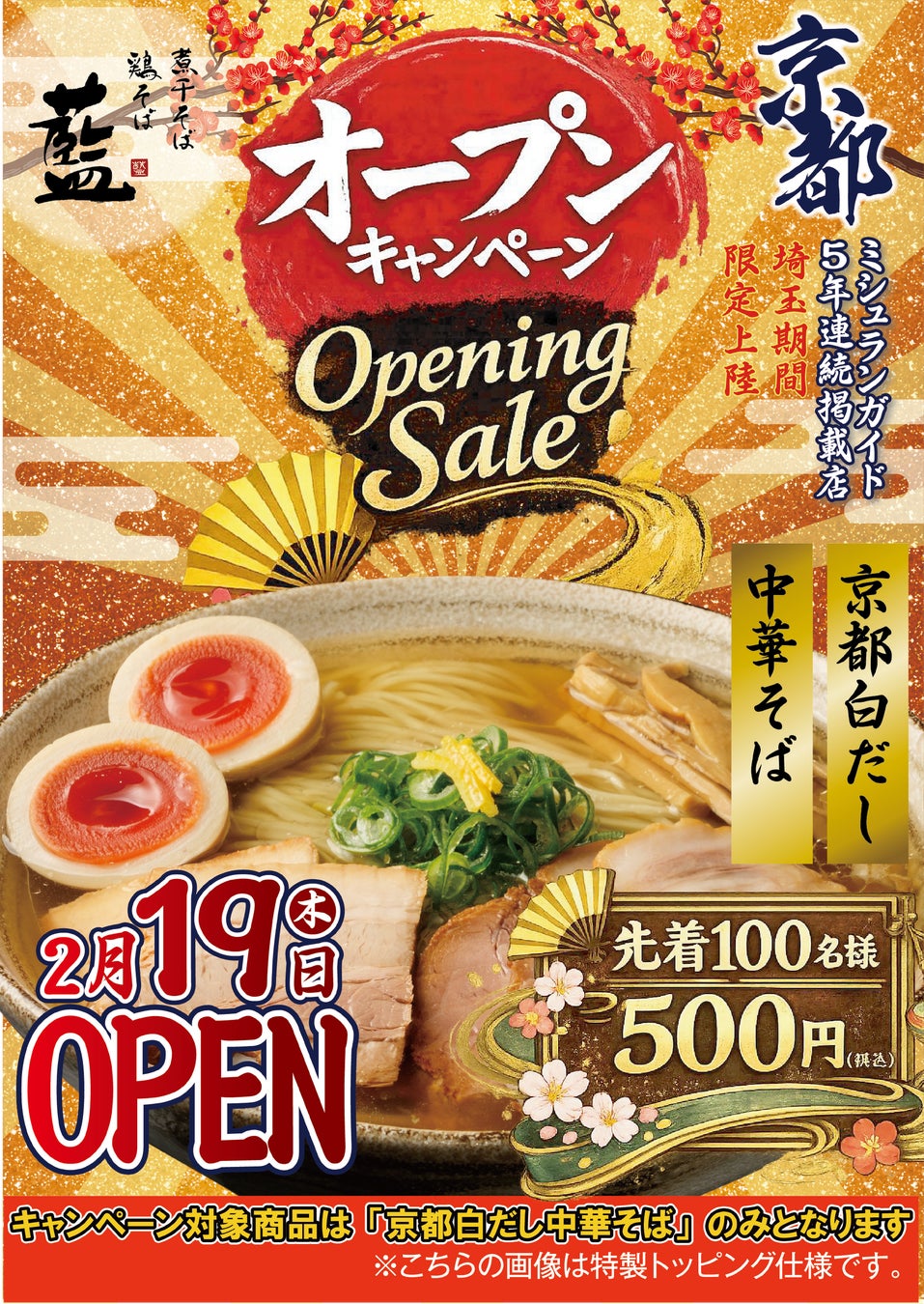 オープンを記念して、2026年2月19日(木)のオープン当日は、先着100名様に「京都白だし中華そば」を500円でご提供いたします!