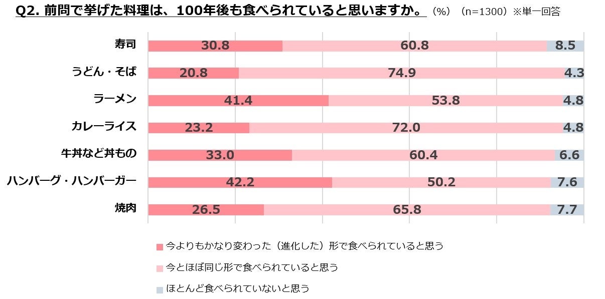 現代の国民食TOP3は「寿司」「うどん・そば」「ラーメン」。100年後、「ラーメン」や「ハンバーグ・ハンバーガー」は「今とはかなり変わった形」になると予測する人が4割強、一方「うどん・そば」「カレーライス」は7割以上が「今とほぼ変わらない」と回答。