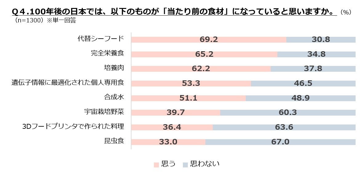 100年後に食べられなくなっていると思う食材は水産資源が上位を独占。一方で、100年後の新常識として「代替シーフード」「完全栄養食」「培養肉」がいずれも6割を超える。