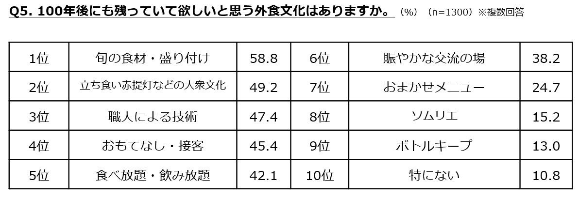 飲食店の形態は、「調理も接客も全てロボット(31%)」と効率化が進む一方で、「人間が作る・運ぶことが超高級な付加価値(26%)」と、人の手によるサービスが「贅沢品」に変わると予想されています。また、100年後も残ってほしい外食文化は「旬の食材、盛り付け」が6割弱で最多となりました。
