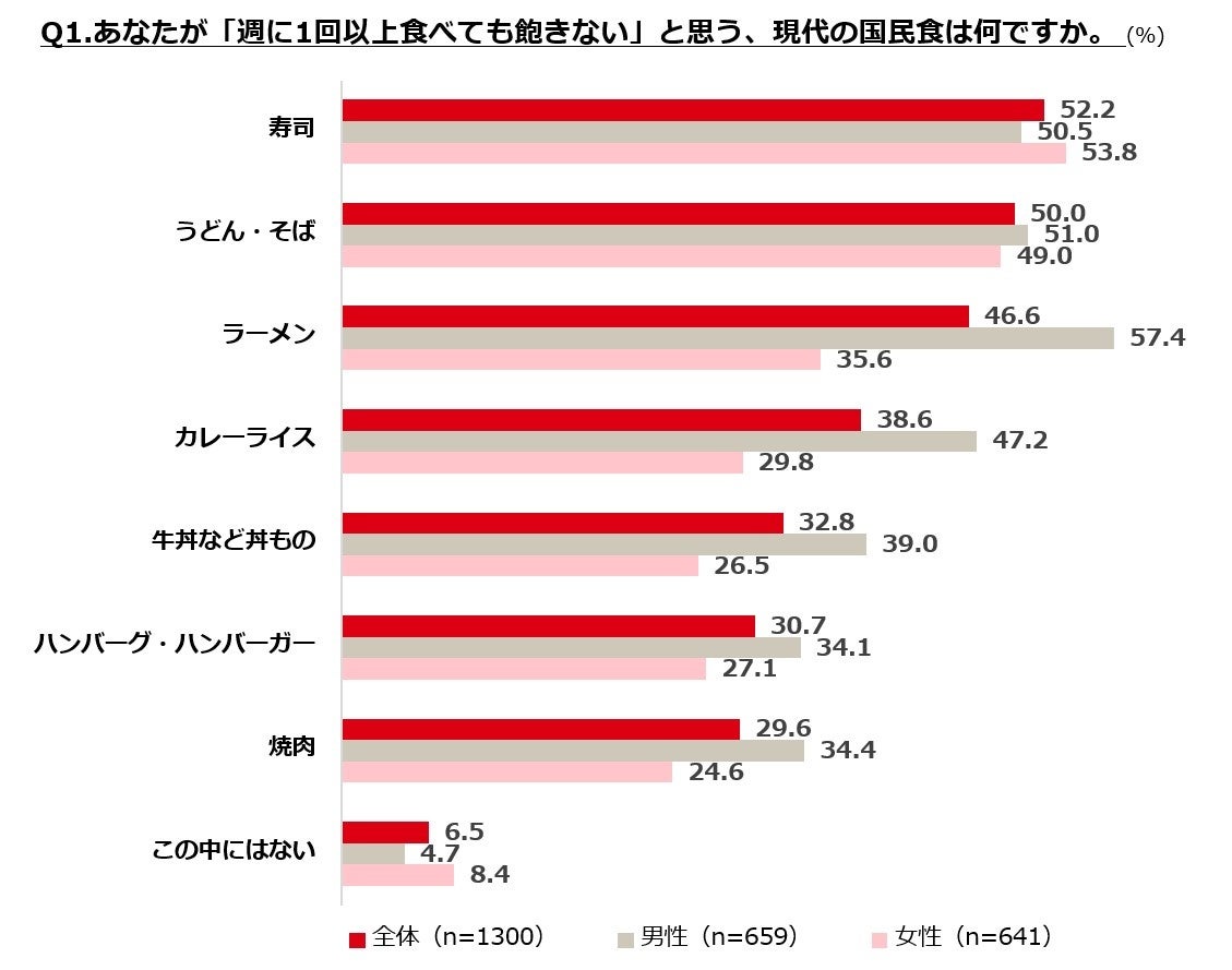 現代の国民食TOP3は「寿司」「うどん・そば」「ラーメン」。中でも「ラーメン」は男性の1位(女性と20pt以上の差)と圧倒的支持。100年後の姿について、「ラーメン」や「ハンバーグ、ハンバーガー」は4割強が「今とはかなり変わった形で食べられている」と予想。対照的に「うどん・そば」「カレーライス」は7割以上が「今とほぼ変わらない」と回答し、料理によって未来の進化の予測に差が出る結果となりました。