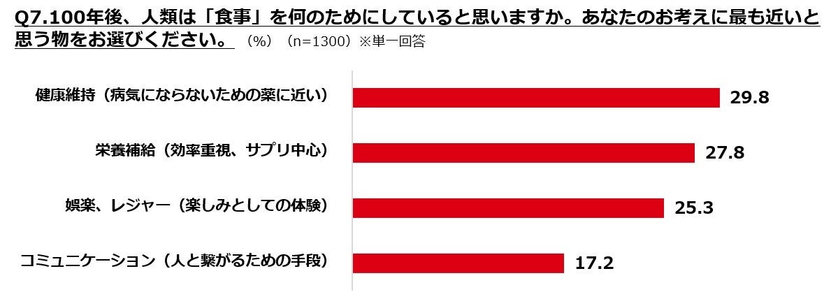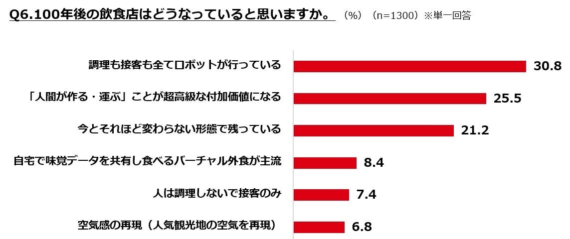 飲食店の形態は、「調理も接客も全てロボット(31%)」と効率化が進む一方で、「人間が作る・運ぶことが超高級な付加価値(26%)」と、人の手によるサービスが「贅沢品」に変わると予想されています。また、100年後も残ってほしい外食文化は「旬の食材、盛り付け」が6割弱で最多となりました。