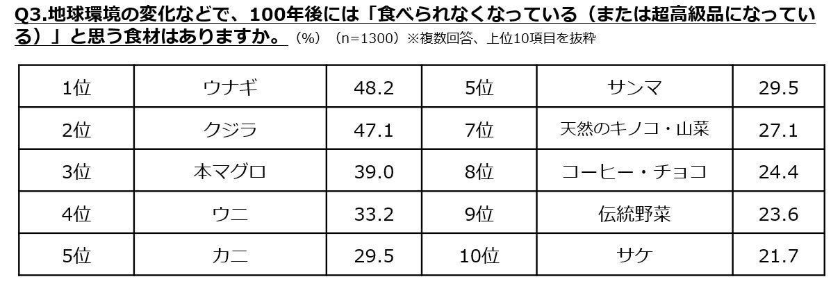100年後に食べられなくなっていると思う食材は水産資源が上位を独占。一方で、100年後の新常識として「代替シーフード」「完全栄養食」「培養肉」がいずれも6割を超える。