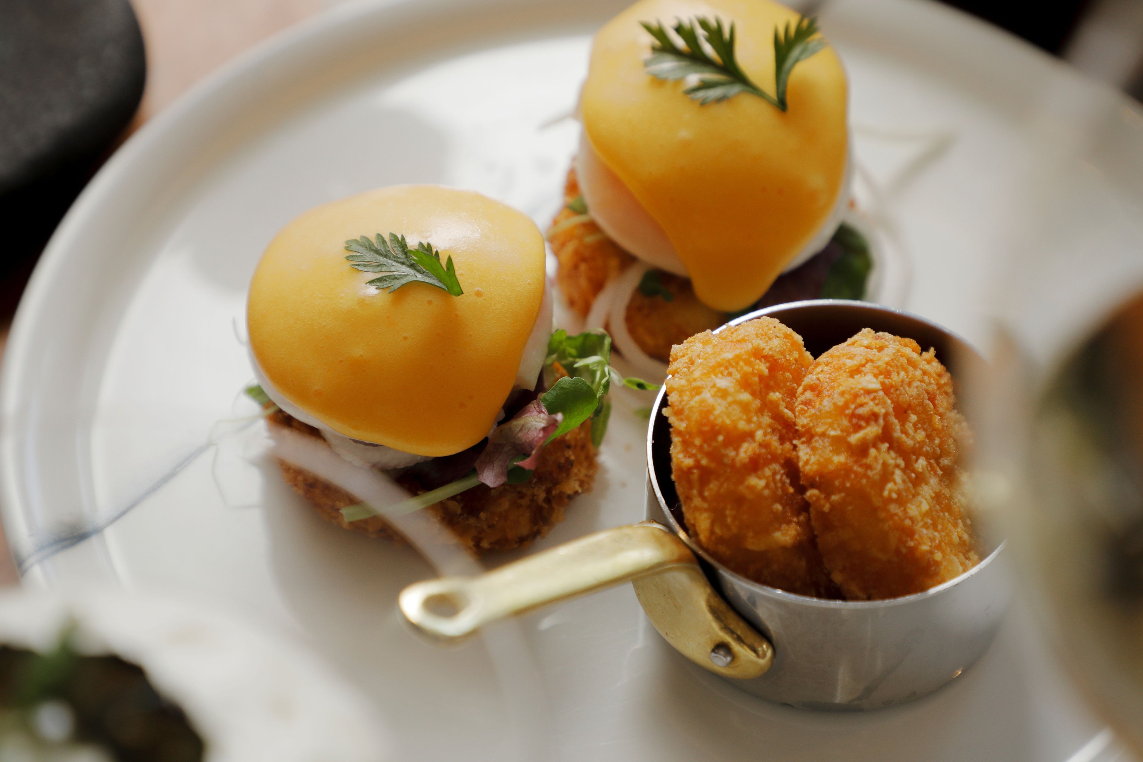 外はかりっと、中はクリーミーなクラブケーキに、大根のピクルスサラダ、ポーチドエッグ、平飼い卵の旨みが凝縮されたサフランオランデーソースを重ねたクラブケーキは、ぜひお試しいただきたいシェフ原田の一押しのひと品です。