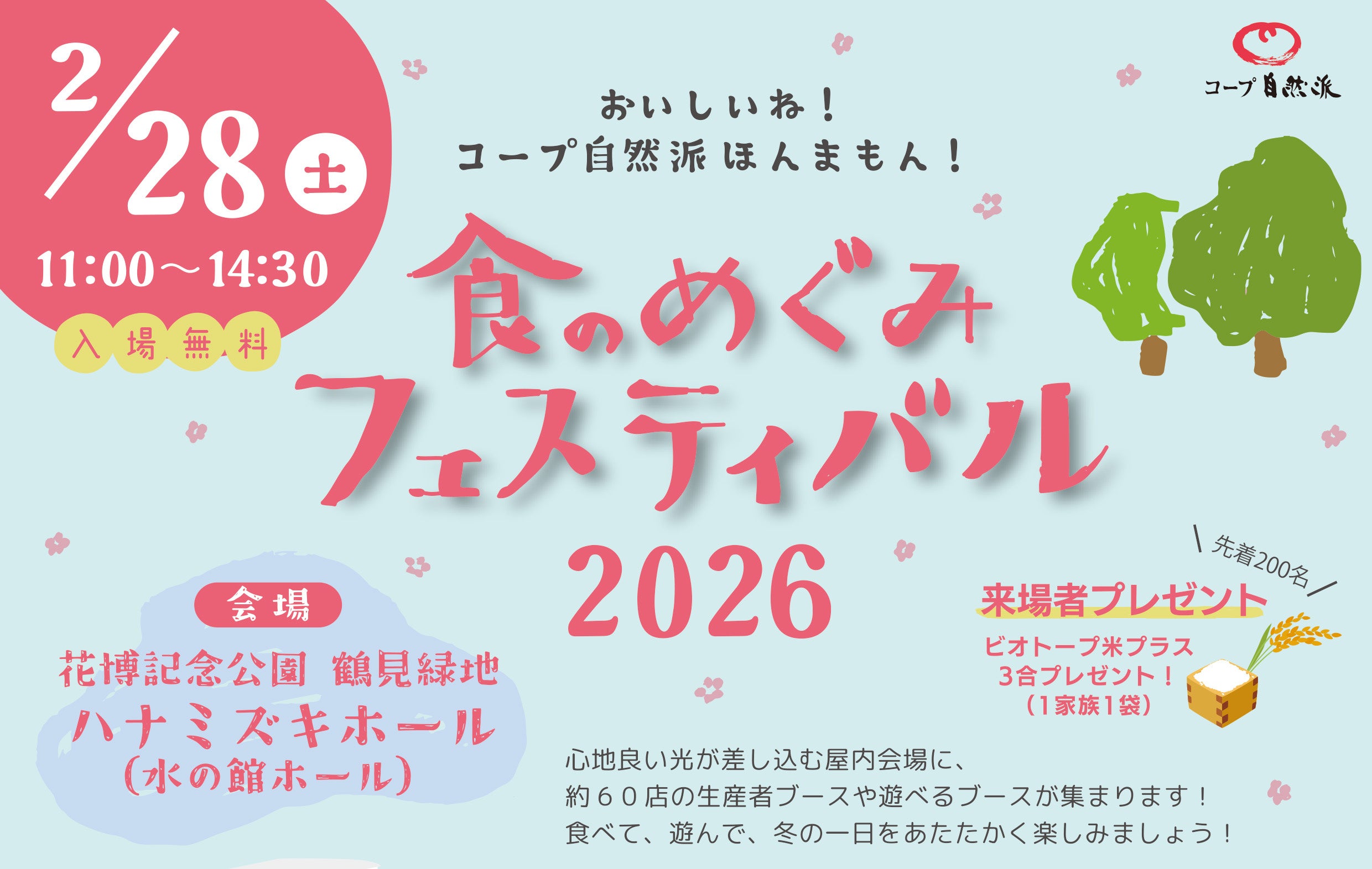 『食のめぐみフェスティバル2026』では、コープ自然派のこだわり生産者とうまいもんが大集合!ナチュラル、オーガニックな商品が並ぶマルシェや子どもと一緒に楽しめる遊べるブースも♪心地よい光が差し込む屋内会場で、生産者の方と直接お話ししながら、お買いものをお楽しみください!