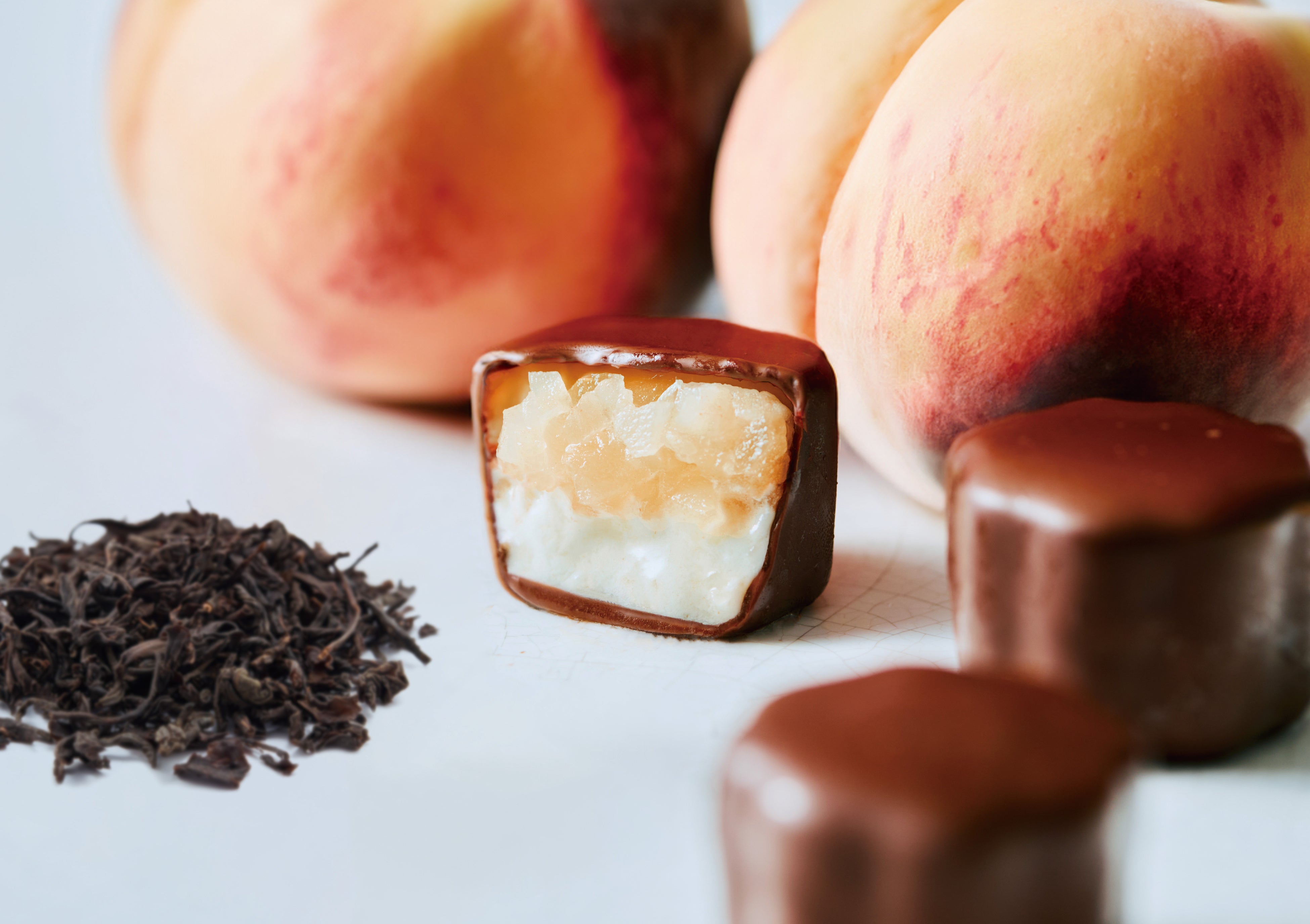 薄く繊細なチョコレートの内側から、果実の香りと生クリームの軽やかな甘みがあふれ出す。まるで果実をそのまま味わうような、みずみずしく贅沢な一口です。限定の味わいは旅するメゾンで出会った白桃と、華やかなアールグレイを合わせて。