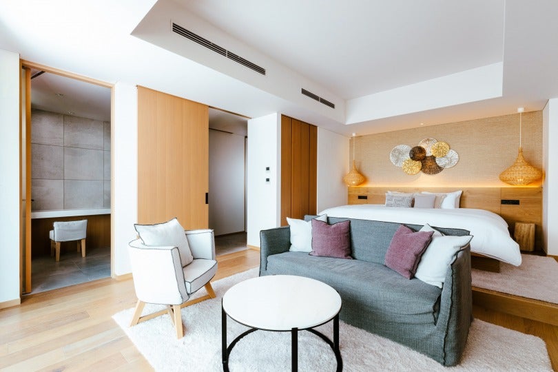 全11室が50㎡以上のオールスイートの客室は、全室から海を望む富士山ビューのスモールラグジュアリーホテルです。客室ごとに異なる眺望とスタイルの違う上質な空間では「何もしない贅沢な時間」をお過ごしいただけます。愛犬と宿泊可能なドッグフレンドリールームのガーデンテラスや、バルコニーでも利用可能なルームサービスではレストランのお料理をお召し上がりいただけ、自由度の高いリゾートステイを叶えます。また、災害時の大規模停電が問題となる昨今、日本のホテルでは初となる、停電時に電気自動車からホテルフロントの照明やコンセントに電力を供給し、携帯電話の充電や暖をとることもできる電力給電システム「V2B:Vehicle to building」と「ワークプレイス・チャージング」を導入し、環境と非常時にも配慮したホテルを目指しております。