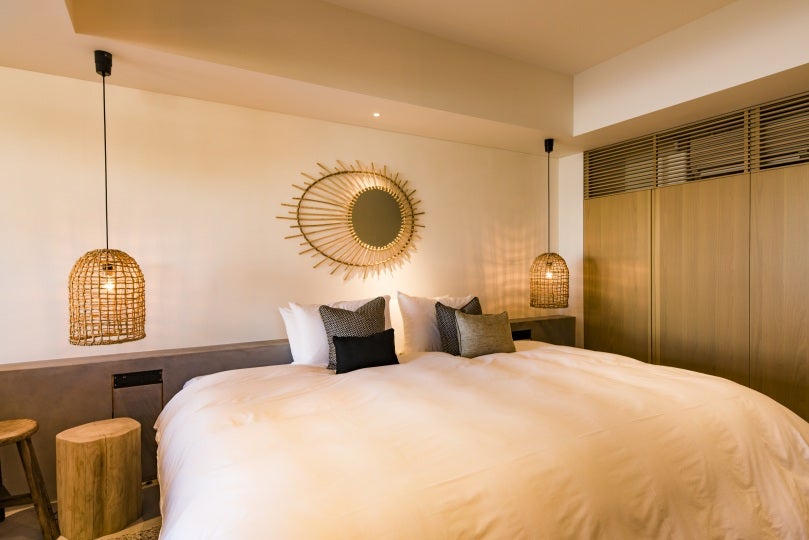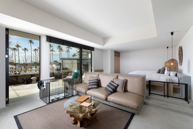 全11室が50㎡以上のオールスイートの客室は、全室から海を望む富士山ビューのスモールラグジュアリーホテルです。客室ごとに異なる眺望とスタイルの違う上質な空間では「何もしない贅沢な時間」をお過ごしいただけます。愛犬と宿泊可能なドッグフレンドリールームのガーデンテラスや、バルコニーでも利用可能なルームサービスではレストランのお料理をお召し上がりいただけ、自由度の高いリゾートステイを叶えます。また、災害時の大規模停電が問題となる昨今、日本のホテルでは初となる、停電時に電気自動車からホテルフロントの照明やコンセントに電力を供給し、携帯電話の充電や暖をとることもできる電力給電システム「V2B:Vehicle to building」と「ワークプレイス・チャージング」を導入し、環境と非常時にも配慮したホテルを目指しております。